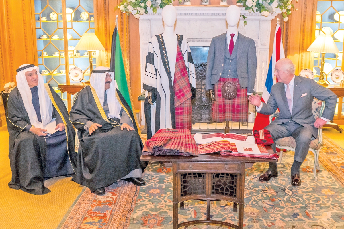 وتبادل سمو الأمير والملك تشارلز، الإزار الاسكتلندي والبشت المصنوع باستخدام تصميم التارتان الخاص (شراكة 125 عاماً)، الذي يجمع بين مواد النسيج التقليدية والأنماط والألوان والتقنيات من المملكة المتحدة والكويت، وذلك في «دمفريس هاوس» بمقاطعة آيرشاير.