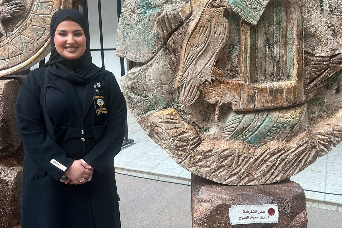 وحول مشاركتها في المعرض، قالت عذاري الشطي إنها قدمت عمل نحت على الفلين لصقر، يعبر عن الهوية الكويتية مع كسرة بخور رمزا للبيئة التراثية، باستخدام تقنية سكب الألوان والألوان الكريليك، مؤكدة سعادتها بالمشاركة التي أتاحت لها الاحتكاك مع الفنانات وتبادل الخبرات.
