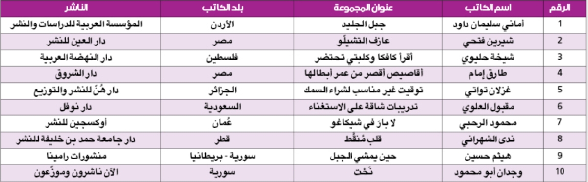 وبناء على مناقشات مستفيضة واجتماعات كثيرة، توصلت اللجنة إلى القائمة الطويلة لهذه الدورة، التي جاءت وفق الترتيب الألفبائي لأسماء كُتَّابها كما يلي: