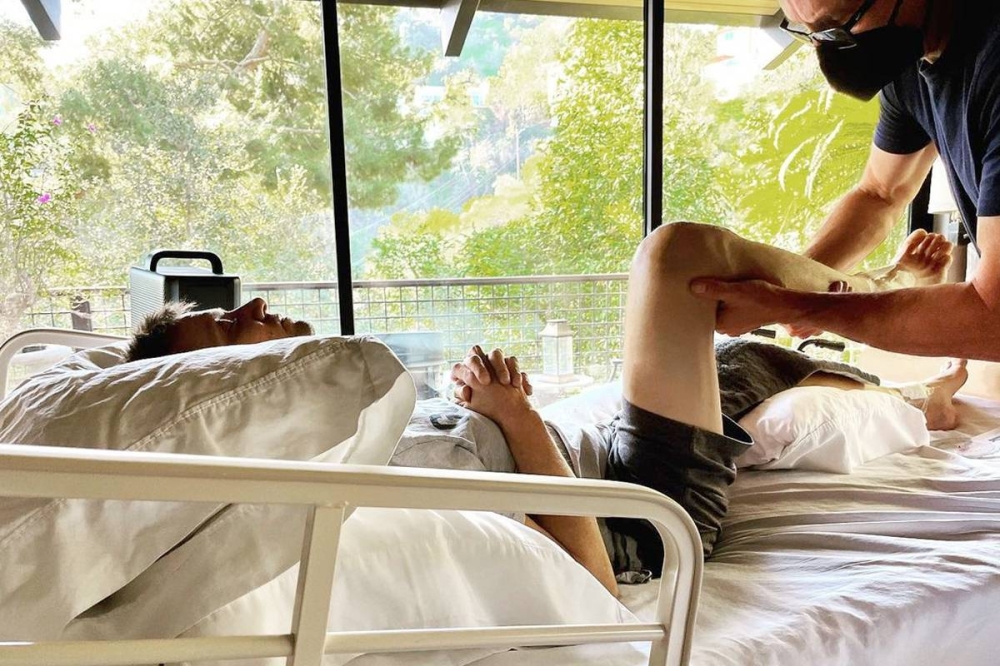 ونشر صورة يظهر فيها مستلقياً على سرير طبي ويداه على صدره، بينما كان رجل يرفع ساقه المثنية عند الركبة.