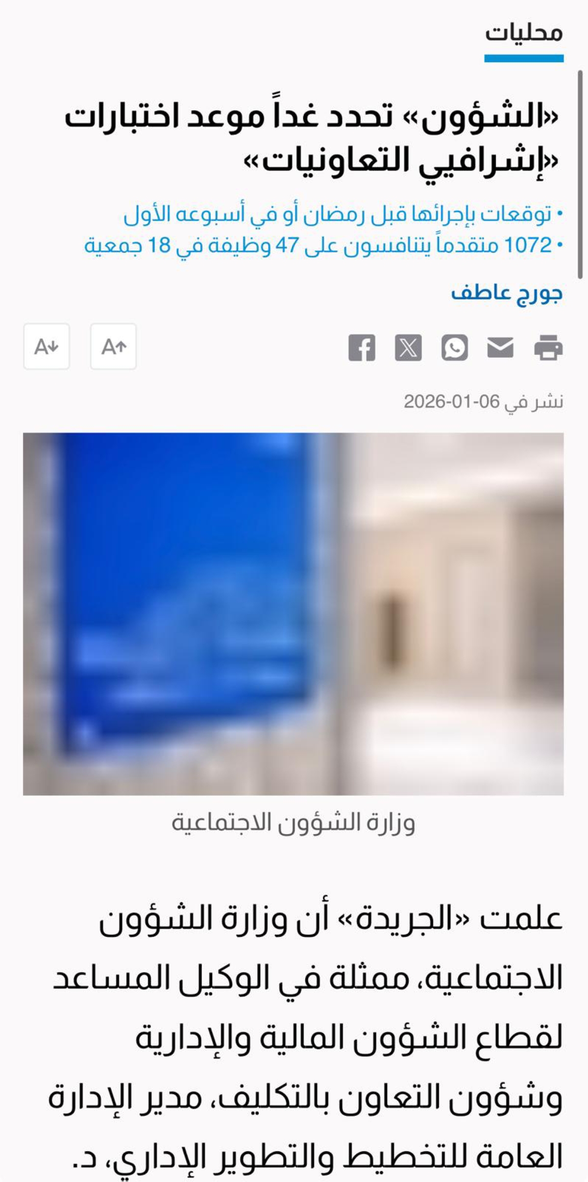 «الشؤون» تحدد اختبارات «إشرافية التعاونيات» 14 فبراير المقبل
