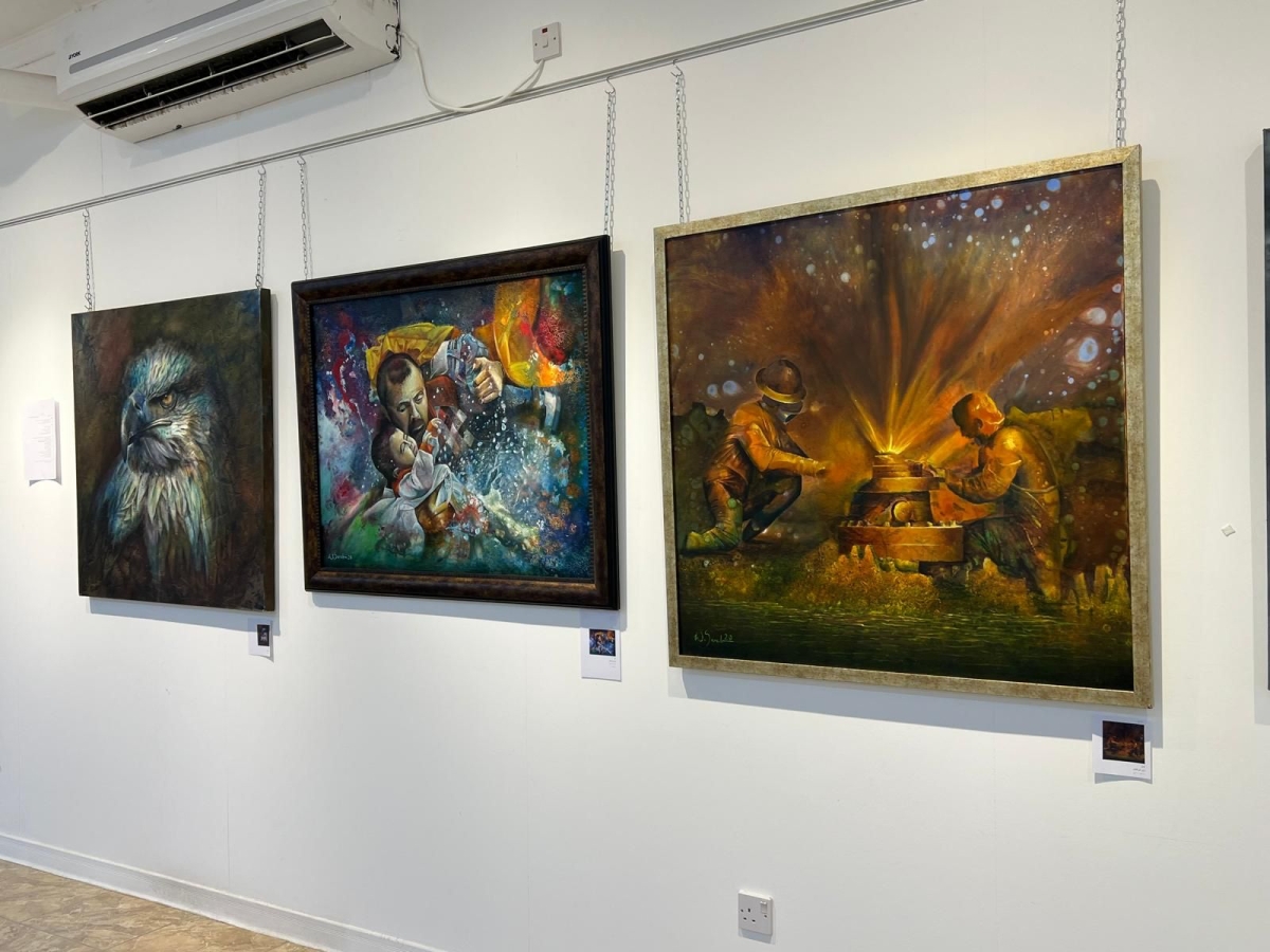 وأضاف أنه شارك بخمسة أعمال فنية مختلفة تنتمي إلى مدارس متعددة، منها لوحة النسر، مبينا أن الطائر كما يبدو للمتلقي يحلق باندفاع فوق سطح مائي ساكن، في معالجة فنية تعتمد على وحدة التكوين واللون لخلق ديناميكية الحركة في اللوحة، ولفت إلى أنه في استخدامه درجات الرمادي منح العمل جوا تأمليا يبرز الإحساس بالسرعة والاندفاع.