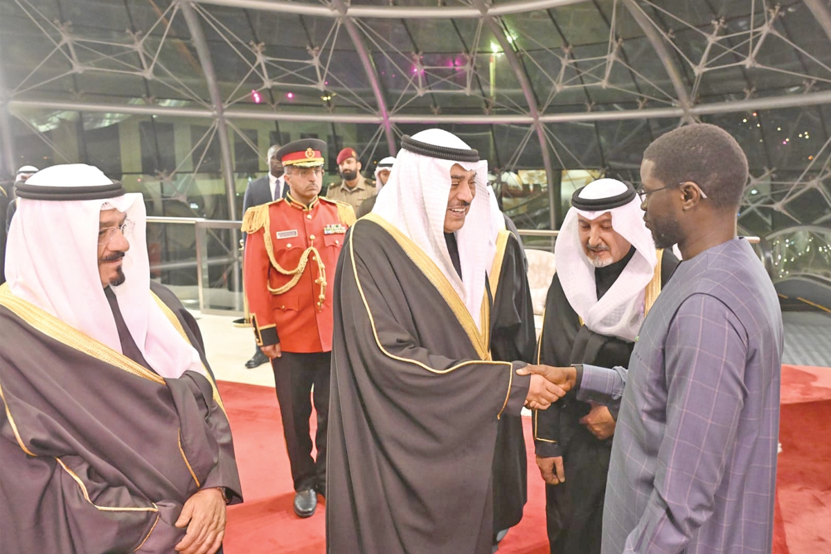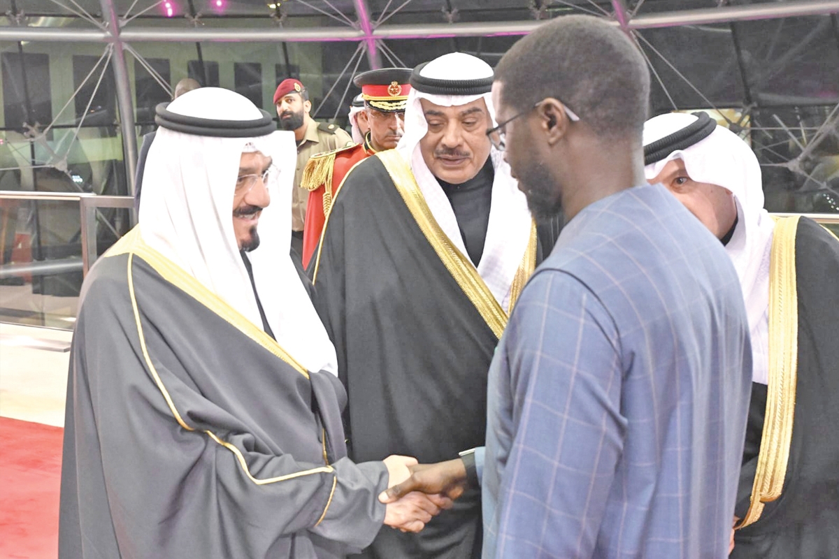 وكان على رأس مستقبليه على أرض المطار سمو ولي العهد الشيخ صباح الخالد، وسمو رئيس مجلس الوزراء الشيخ أحمد العبدالله، كما كان في استقباله وزير شؤون الديوان الأميري الشيخ حمد جابر العلي، ورئيس ديوان سمو ولي العهد الشيخ ثامر جابر الأحمد، والمستشار بديوان رئيس مجلس الوزراء رئيس بعثة الشرف المرافقة، الشيخ د. باسل حمود المالك، ونائب مساعد وزير الخارجية لشؤون إفريقيا السفير نايف محمد المضف.