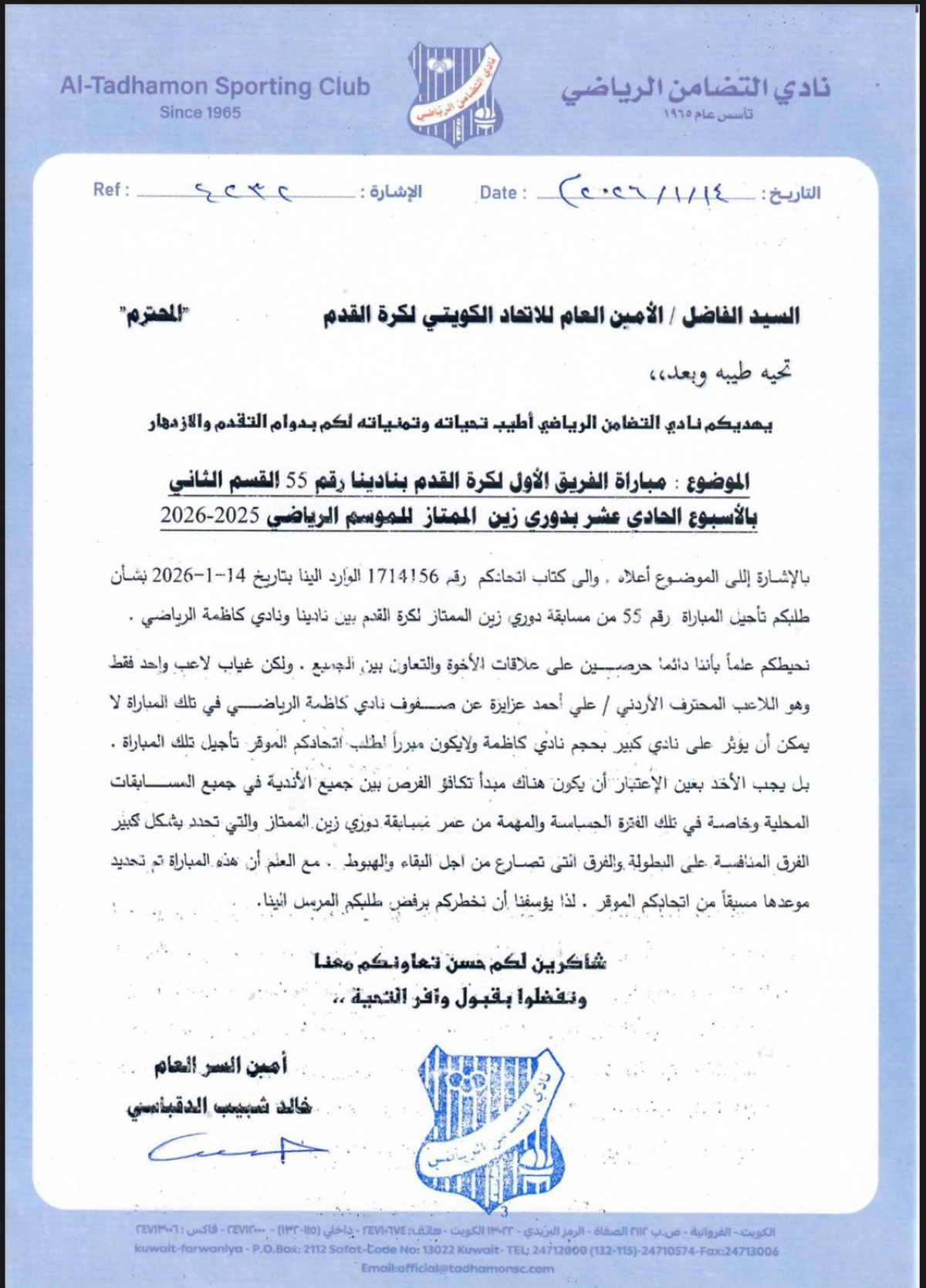 وقال التضامن في كتابه إن غياب اللاعب علي العزايزي لا يؤثر على نادٍ كبير بحجم كاظمة، ولا يمكن أن يكون مبرراً للاتحاد لتأجيل اللقاء.