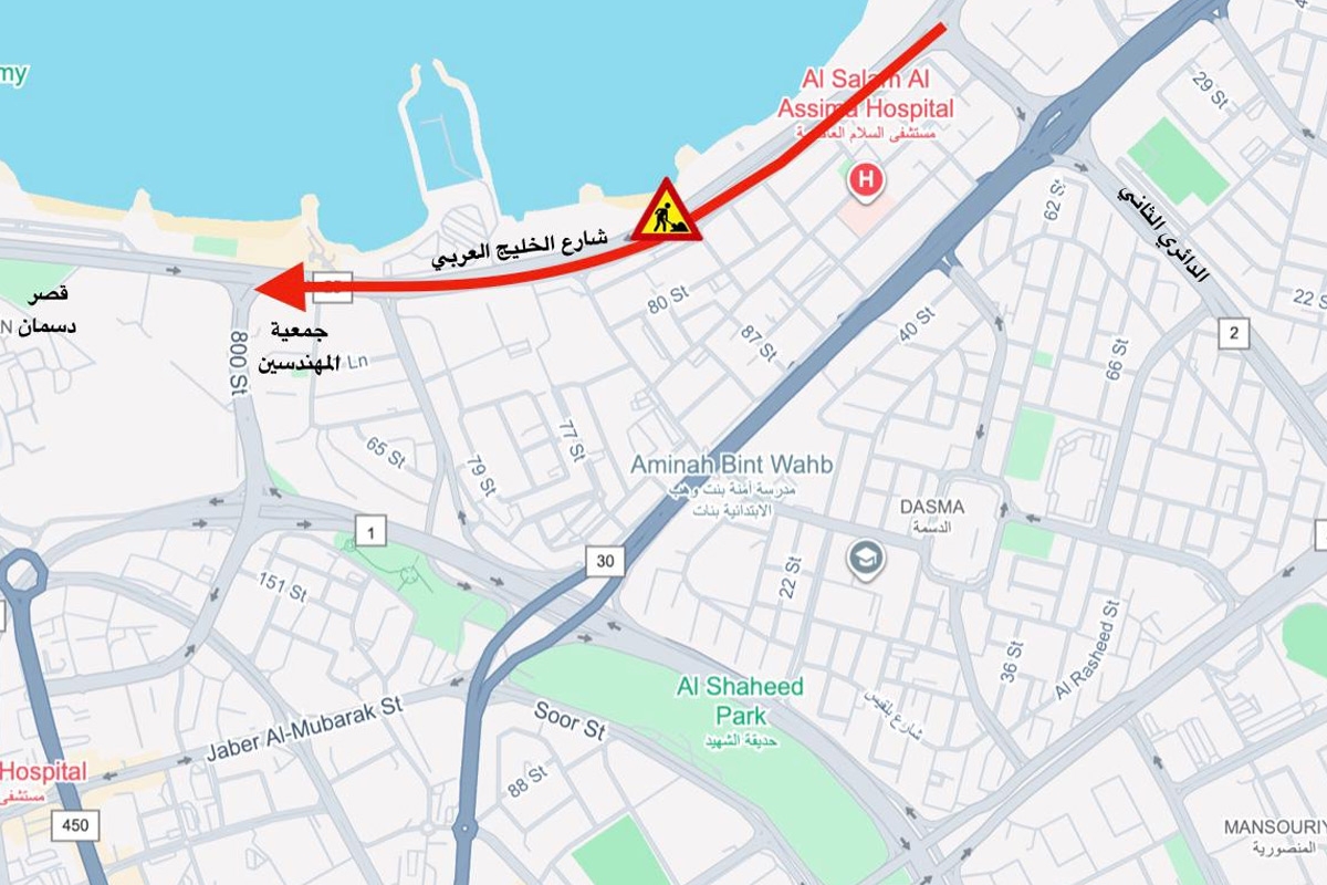 أعلنت الإدارة العامة للمرور إغلاقاً كلياً لشارع الخليج العربي من تقاطع الدائري الثاني وصولاً إلى تقاطع جمعية المهندسين الكويتية، اعتباراً من السادسة مساء اليوم حتى السادسة من صباح الأحد المقبل.