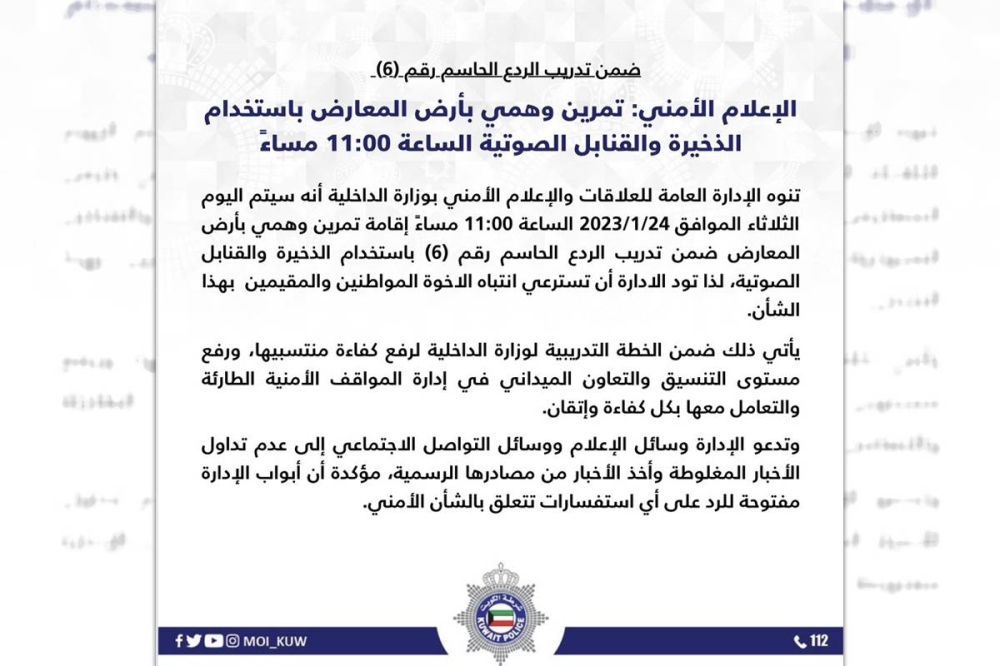 وأعلنت الإدارة العامة للعلاقات والإعلام الأمني بالوزارة أن التمرين يأتي ضمن الخطة التدريبية لوزارة الداخلية لرفع كفاءة منتسبيها، ورفع مستوى التنسيق والتعاون الميداني في إدارة المواقف الأمنية الطارئة والتعامل معها بكل كفاءة وإتقان.