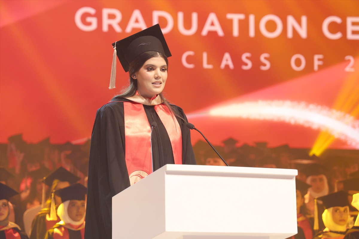 وقالت الخرّيجة فجر المنيّع: «نقف اليوم على هذا المسرح لنكرّم رحلتنا المشتركة وكل من سار معنا خلالها. أتوجّه بالشكر إلى رئيس مجلس الأمناء، الأستاذ فهد العثمان، ورئيس مجلس الإدارة، الأستاذ طارق العثمان على بنائهما بيتاً احتوانا وكان مساحة صاغت شخصياتنا، فـ AUM كانت ولا تزال بيتنا، كما أشكر أساتذتنا الذين كانوا سبب نجاحنا، وأعبّر عن امتناني العميق لأهلنا وعائلاتنا على كل دعاء وتضحية. شعار AUM هو We are as good as our students، ونحن بدورنا ما كنّا لنكون على ما نحن عليه لولاها».