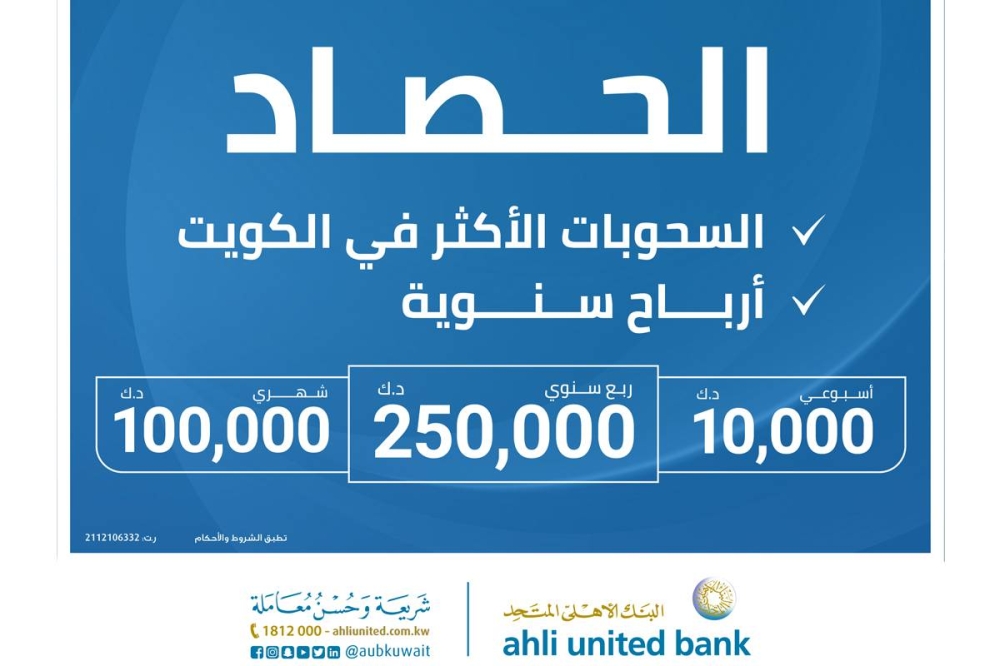 ويقدم حساب الحصاد الإسلامي في باقته الحالية مجموعة أوسع من المزايا، حيث يحظى الرابحون من عملاء «المتحد» بجائزة شهرية بقيمة 100000 د.ك، إضافة إلى 10 جوائز أسبوعية بقيمة 1000 دينار لكل جائزة. وتبقى الجوائز ربع السنوية الكبرى بقيمة 250000 د.ك نقدا للرابح هي أهم ما يطمح إليه العملاء، حيث تمثل لهم فرصة حقيقية لتحقيق حلم العمر. وفضلا عن هذه الباقة من الجوائز الجذابة، هناك أيضا أرباح سنوية متوقعة على أساس عقد الوكالة، وهو ما يزيد جاذبية حساب الحصاد الإسلامي.