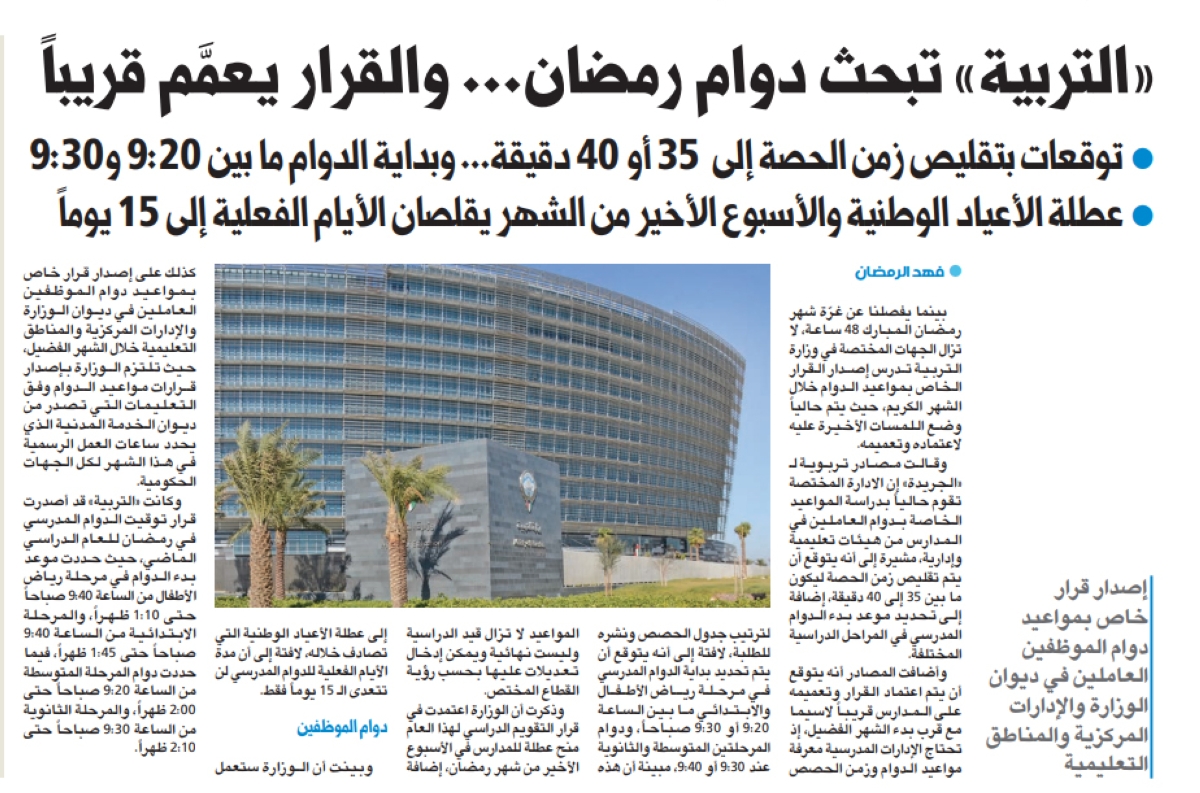 تأكيدا لما نشرته «الجريدة»، في عددها أمس، بشأن قرب صدور قرار مواعيد دوام شهر رمضان، أصدر وكيل وزارة التربية بالتكليف، م. محمد الخالدي، قراراً بشأن توقيت الدوام المدرسي للطلبة خلال شهر رمضان المبارك في المدارس.