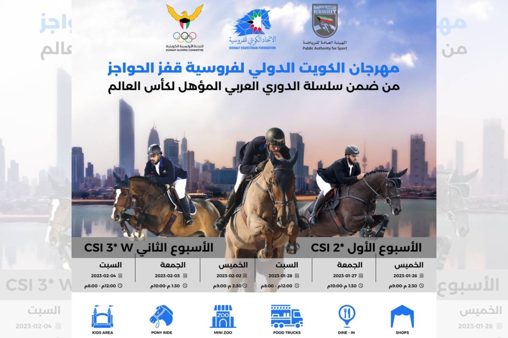 تنطلق في الثانية والنصف ظهر اليوم (الخميس) منافسات مهرجان الكويت الدولي لفروسية قفز الحواجز في مضمار مركز الكويت للفروسية بمنطقة صبحان، بمشاركة أكثر من 100 فارس وفارسة، ونحو 150 حصاناً، وتم رصد جوائز مالية للفائزين بالمراكز الأولى أكثر من 77 ألف دينار، بدعم ورعاية من الهيئة العامة للرياضة، واللجنة الأولمبية الكويتية، والاتحاد المحلي للعبة.