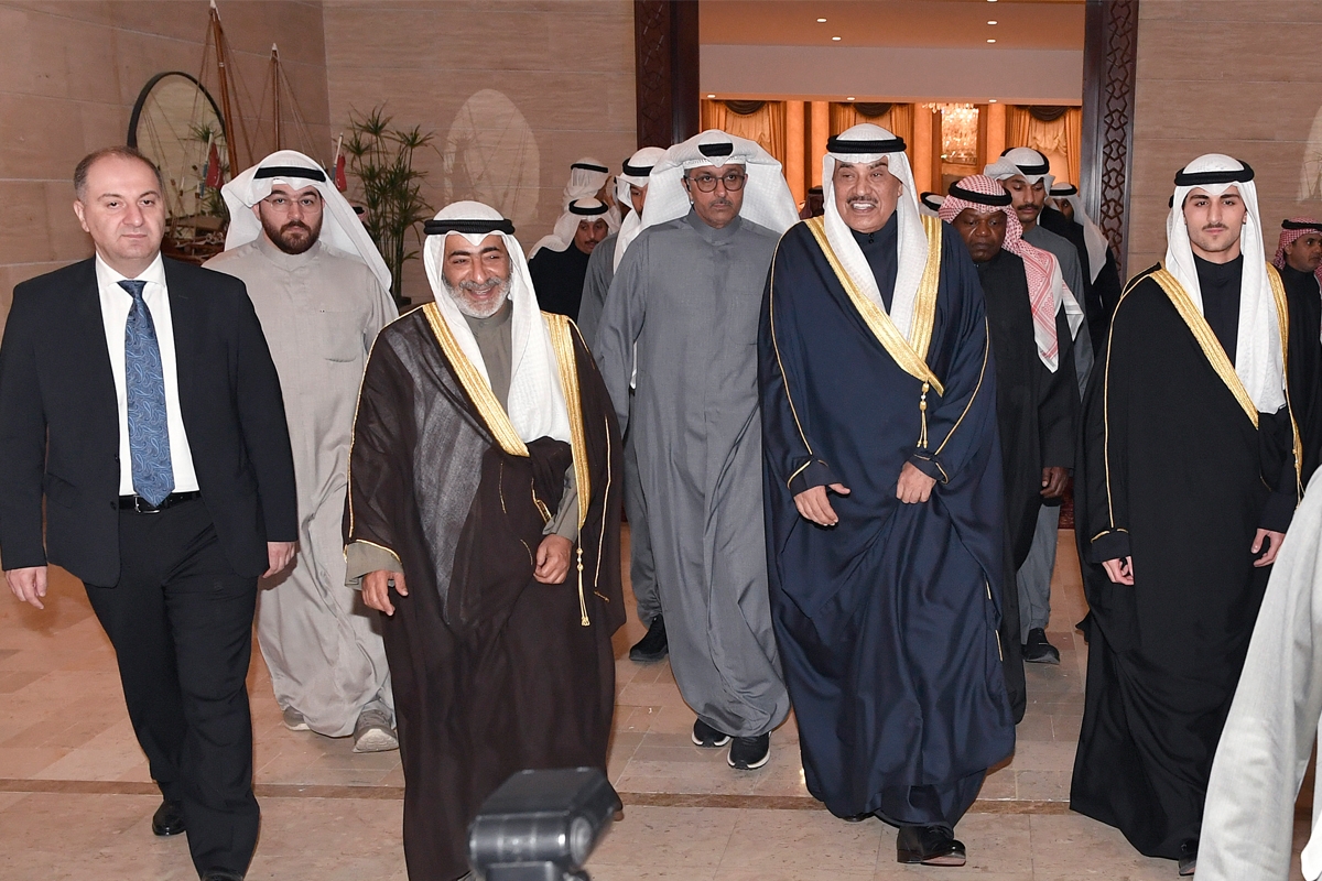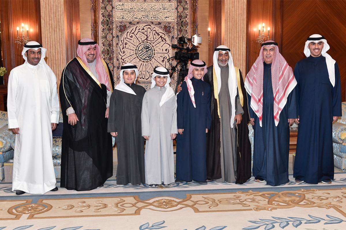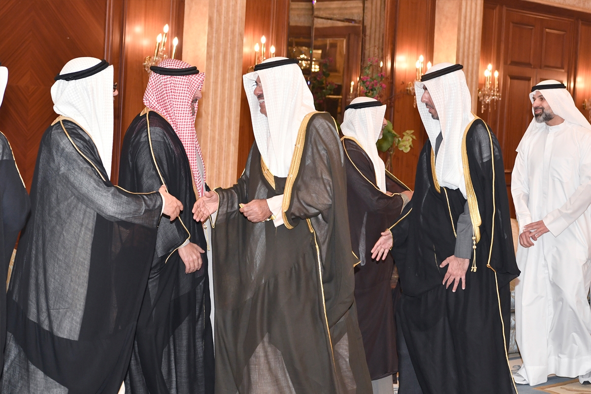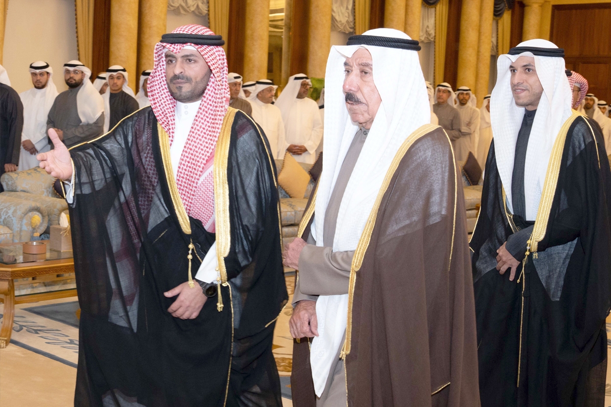 عبدالله سالم الصباح وثامر العلي يتوسطان بعض أبناء الأسرة خلال الاستقبال