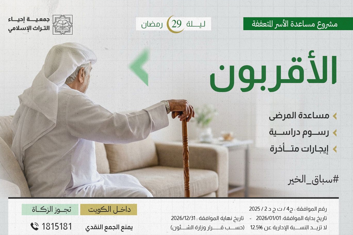 طرحت جمعية إحياء التراث الإسلامي حملة خيرية بعنوان «الأقربون»، والتي يتم من خلالها بتبرع واحد المساهمة في 3 مشاريع مهمة للأسر المحتاجة داخل الكويت.