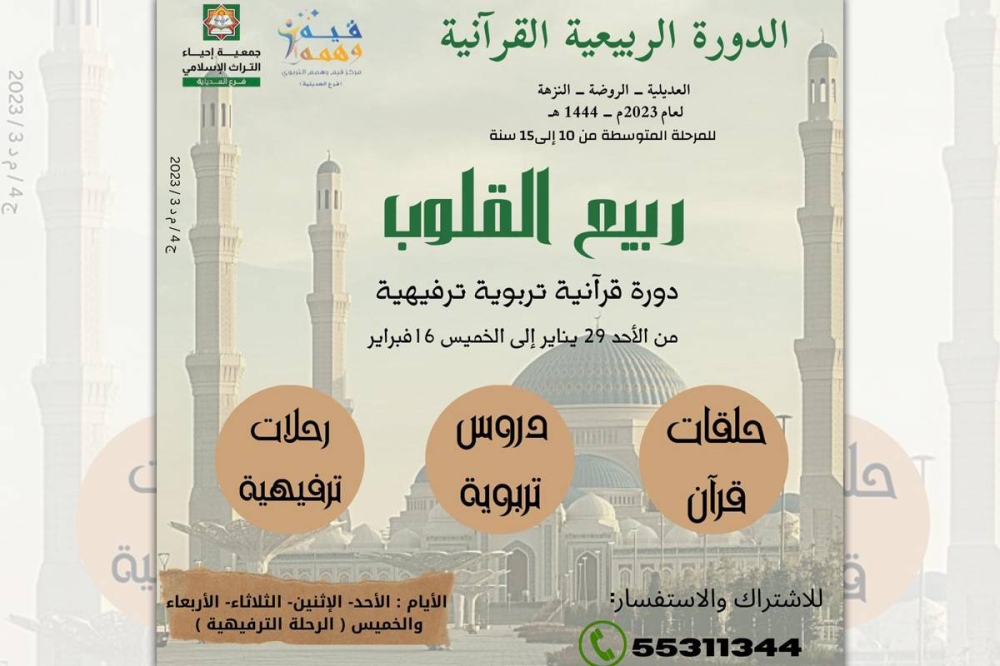 ولفتت الجمعية، في بيان اليوم، إلى تنظيم الدورة الربيعية القرآنية «ربيع القلوب» لمرحلة المتوسط، التي يشرف عليها مركز قيم وهمم التربوي في منطقة العديلية، وهي مخصصة للأعمار من (10 - 15) سنة، وستستمر حتى 16 فبراير المقبل. وقالت إن مركز قيم وهمم الدعوي ينظم كذلك في مدينة سعد العبدالله سلسلة من الدروس والمحاضرات الأسبوعية والأنشطة الثقافية، منها اللقاء الشهري بعنوان «وصايا من القرآن الكريم» للشيخ د. محمد النجدي في مخيم فرع سعد العبدالله.