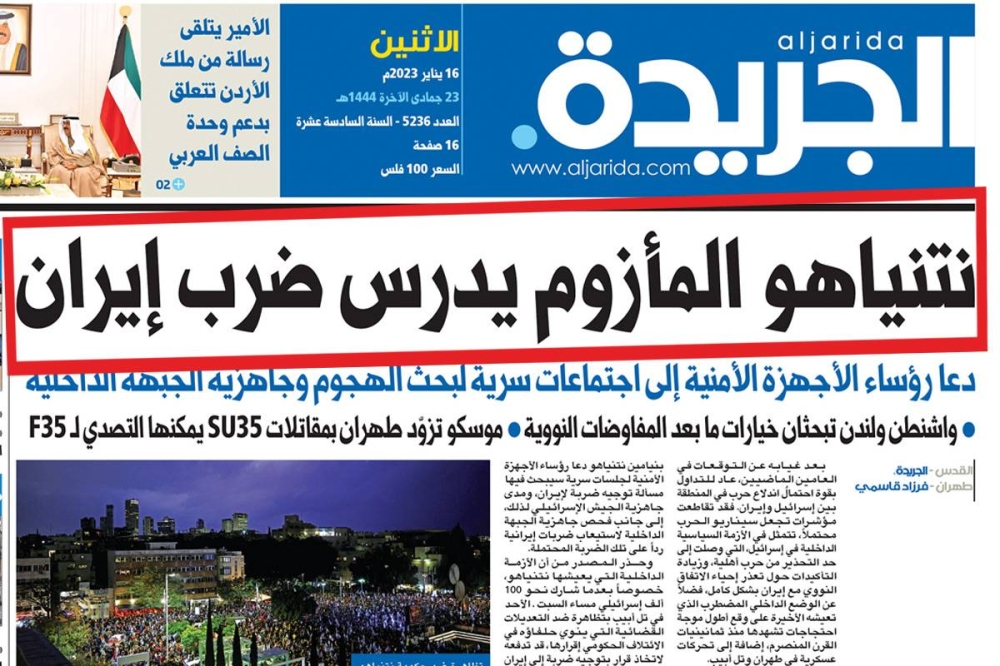 وكانت «الجريدة» أشارت في تقريرها إلى أن نتنياهو دعا رؤساء الأجهزة الأمنية إلى اجتماع سري لبحث طبيعة وحجم الهجوم ومدى جاهزية الجبهة الداخلية. وقال المصدر لـ «الجريدة»، إن الضربات تقررت في ذلك الاجتماع، قبل التصعيد غير المسبوق بين الفلسطينيين والإسرائيليين، والذي ابتدأ باقتحام إسرائيلي وحشي لمخيم جنين في الضفة الغربية المحتلة، الخميس الماضي، وقتل خلاله 9 فلسطينيين معظمهم ينتمون إلى حركة «الجهاد الإسلامي» المرتبطة بطهران.