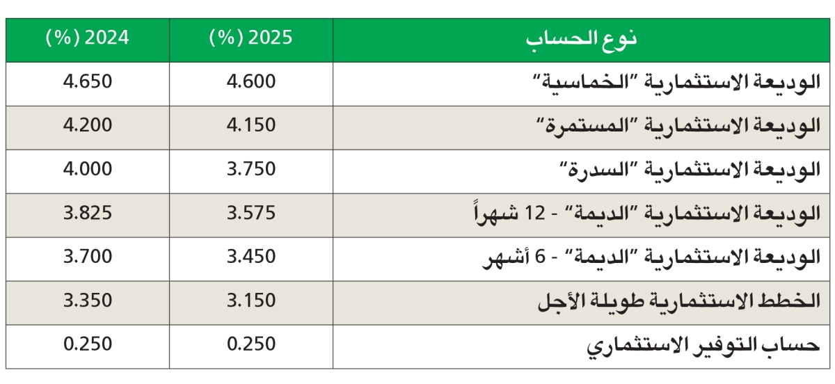 وبلغ رصيد حسابات المودعين 21.0 مليار دينار، وبلغ معدل كفاية رأس المال 19.81 في المئة مقارنة بنسبة 19.89 في المئة في 31 ديسمبر 2024، ويوصي مجلس الإدارة، الجمعية العمومية بمنح المساهمين توزيعات نقدية بنسبة 24 في المئة متضمنة نسبة 10 في المئة التي تم توزيعها خلال منتصف العام، وتوزيع أسهم منحة بنسبة 7 في المئة، في ضوء ما تم من توزيع عوائد على الودائع الاستثمارية وحساب التوفير كما هو موضح في الجدول أدناه*.