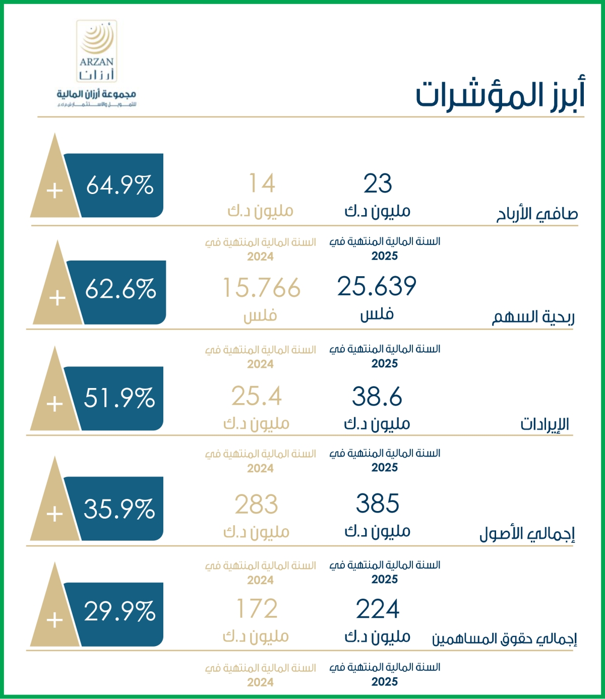 «أرزان» تربح 23 مليون دينار في 2025 بنمو 65%