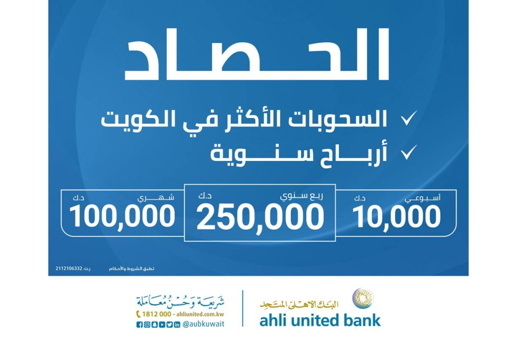 ضمن برنامج الحصاد الإسلامي، حساب السحب الأول على الجوائز الذي يقدمه البنك الأهلي المتحد، يقام (الأربعاء) السحب الشهري الذي يترقبه عملاء «الحصاد» لإعلان الرابح الذي سيفوز بالجائزة البالغة قيمتها 100.000 دينار، تحت إشراف وحضور ممثلي وزارة التجارة في المبنى الرئيسي ل«المتحد».