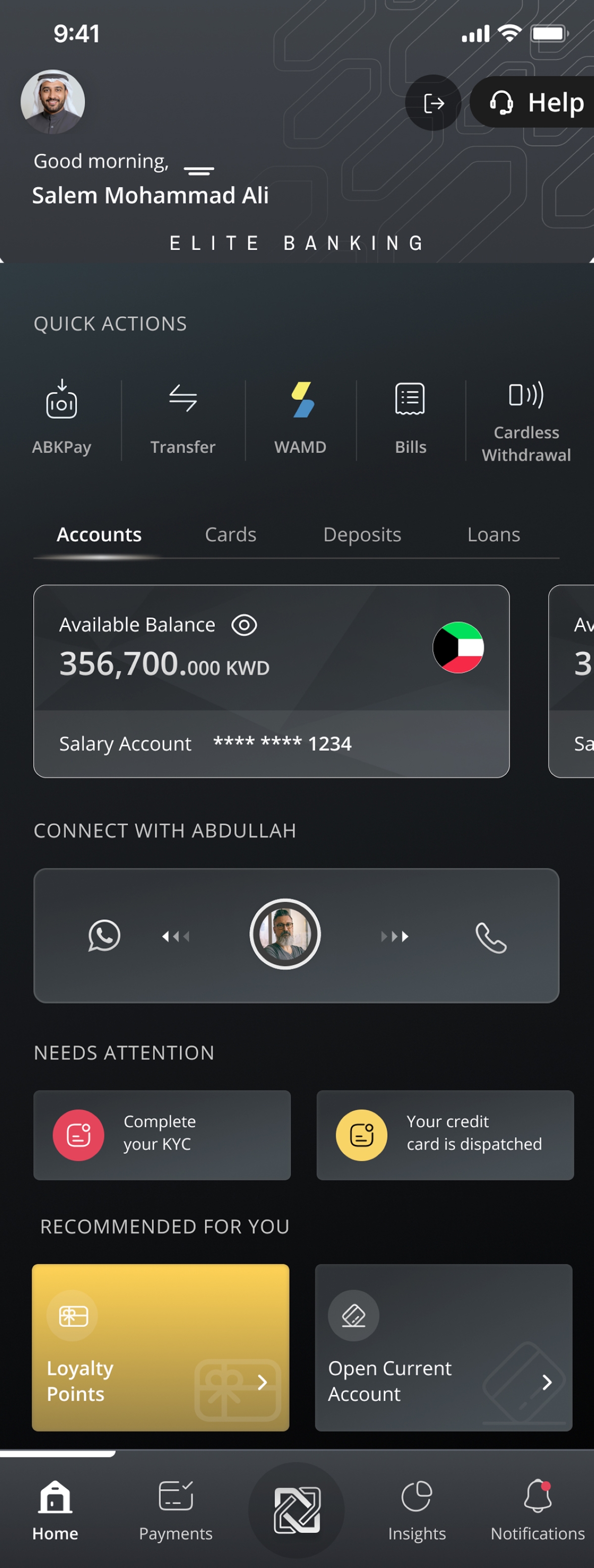 تم تخصيص تجارب الخدمة الذاتية من خلال تقسيم العملاء، مع واجهات مخصصة مثل «الوضع الداكن أو الفاتح» لكل شريحة مع طابع يميز تجربة عملاء البنك بطريقة فريدة من نوعها عبر 3 شرائح: عملاء «ABK Wealth Management»، وعملاء «Elite»، وجميع العملاء. ليتم تقديم تجربة مميزة ذات طابع وأسلوب خاص يعكس القيمة المضافة وعمق الخدمة ومستويات التفاعل مع كل عميل.