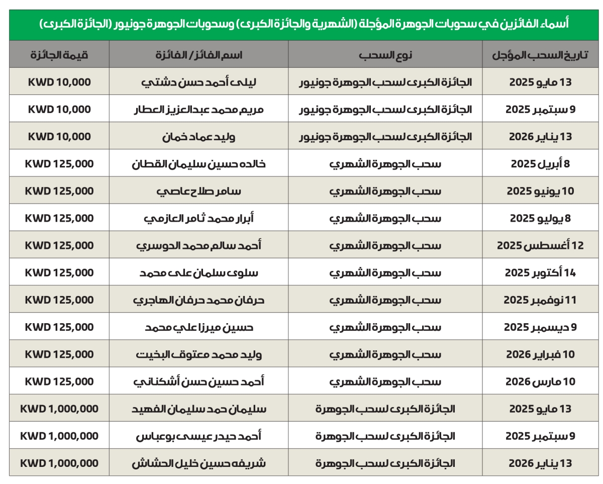 أما بالنسبة لسحوبات الجوهرة جونيور المخصص للعملاء الذين تقل أعمارهم عن 21 عاماً، فيتم السحب شهرياً على 7 جوائز نقدية (1000 دينار لثلاثة فائزين، و500 دينار لأربعة فائزين)، إضافة إلى فائز واحد بجائزة نقدية قيمتها 10 آلاف دينار مع كل سحب من سحوبات الجوهرة على الجائزة الكبرى.