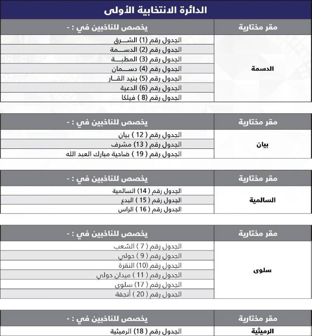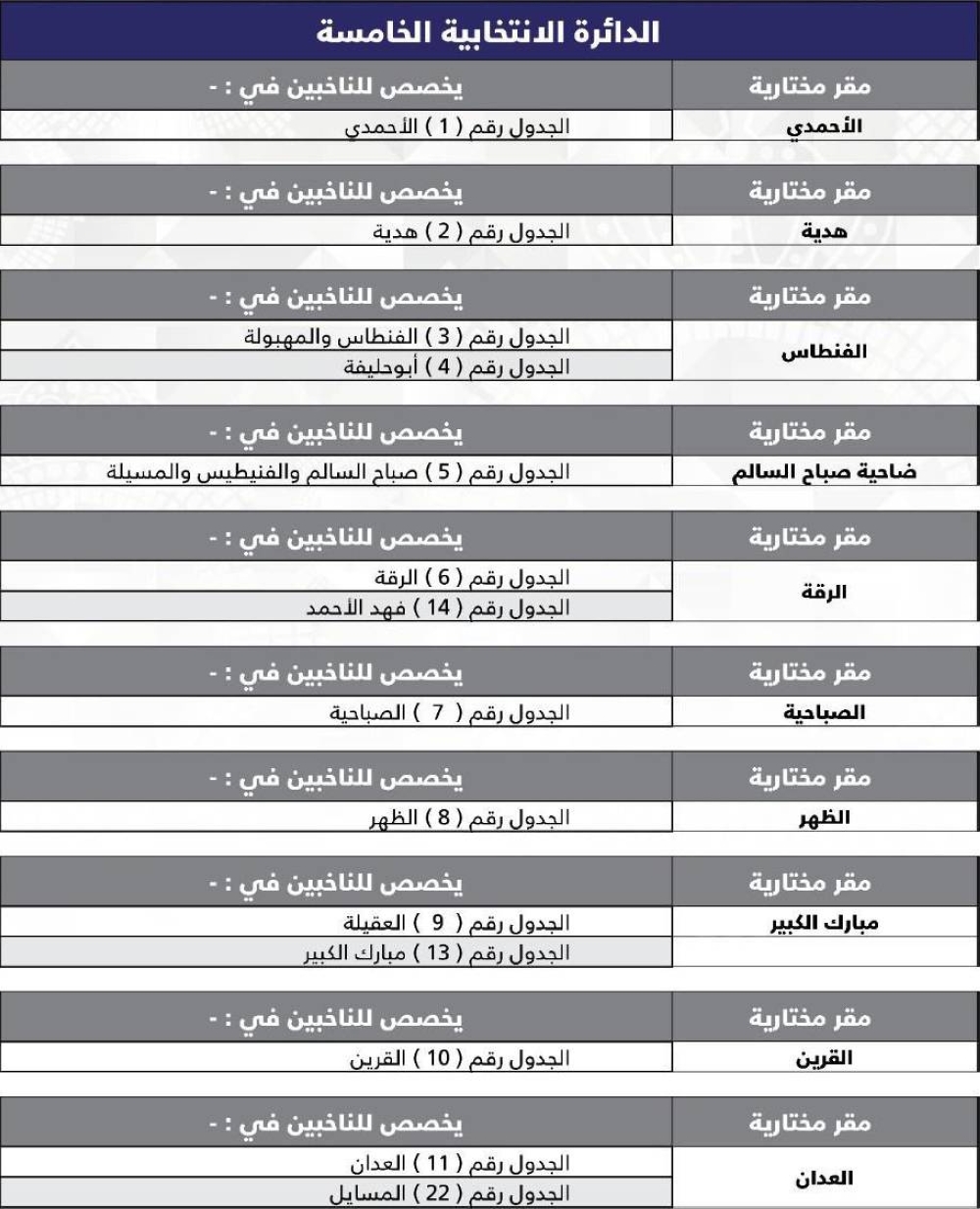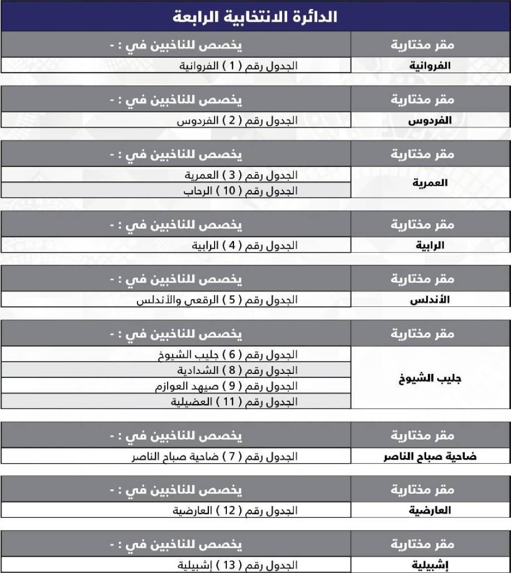 وتسهيلاً للمواطنين فإن الجداول المخصصة للقيد موزعة بالدوائر الانتخابية على النحو التالي: