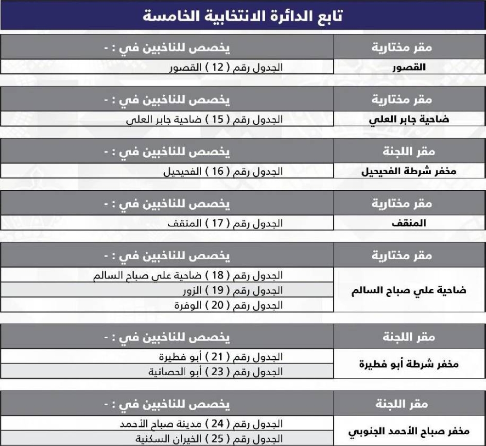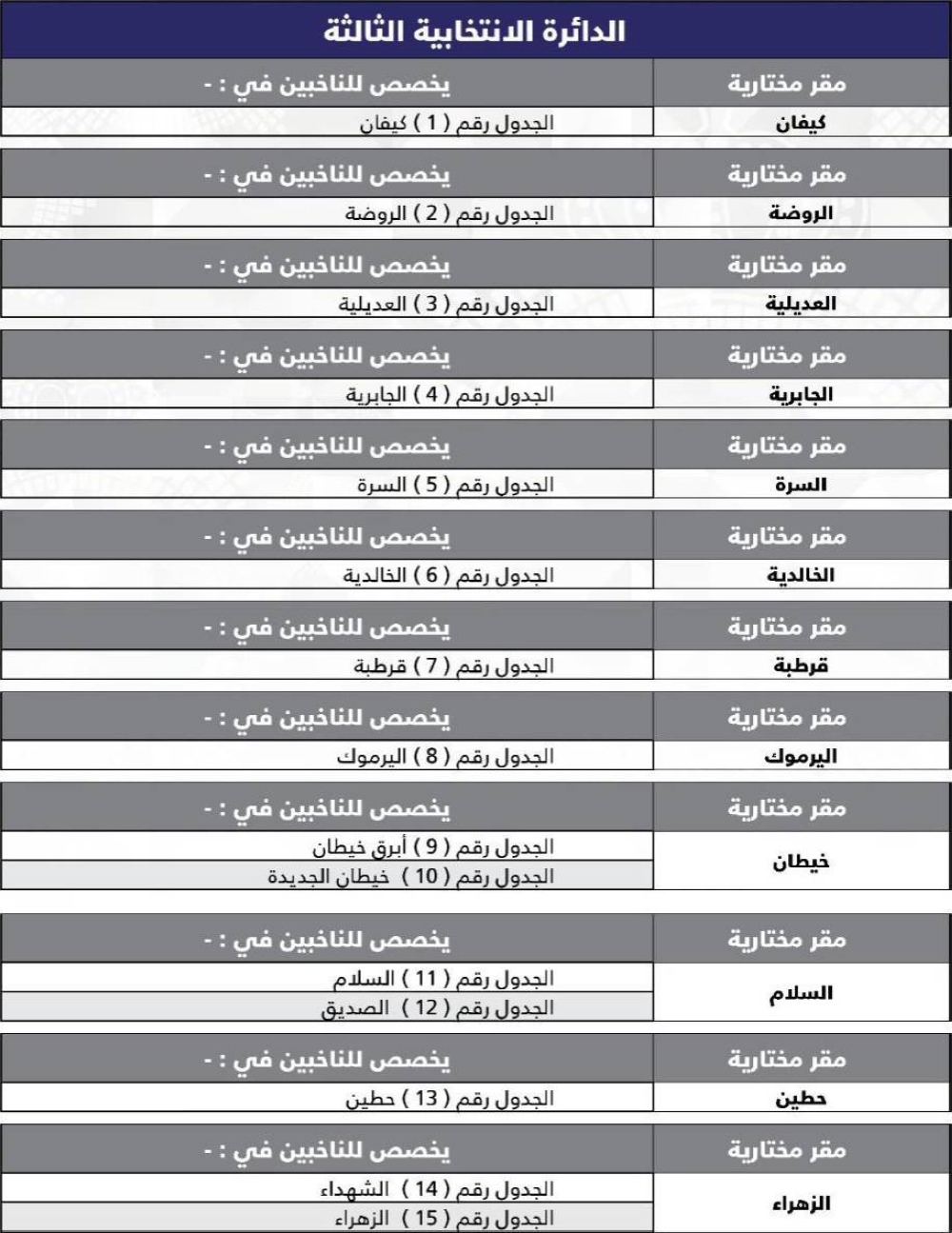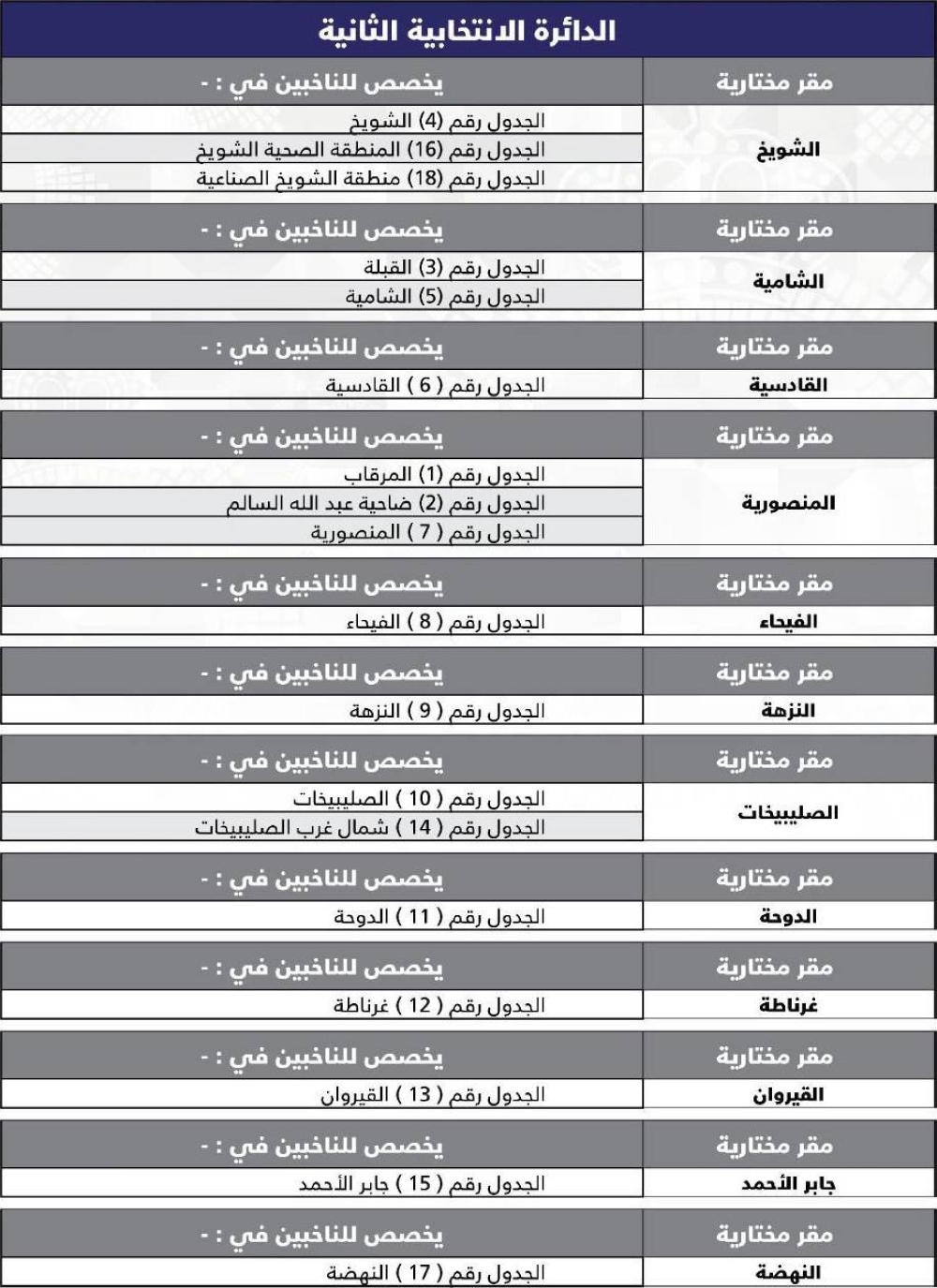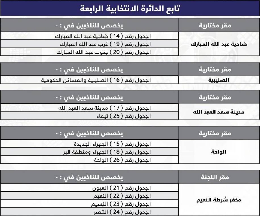 وتسهيلاً للمواطنين فإن الجداول المخصصة للقيد موزعة بالدوائر الانتخابية على النحو التالي: