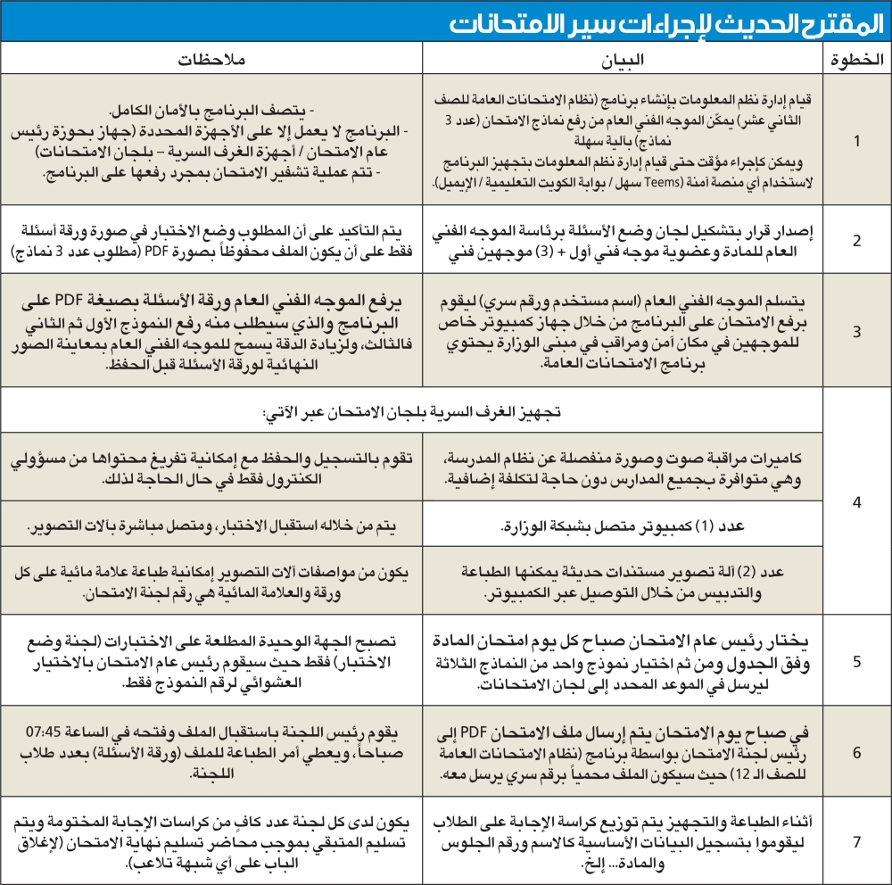 وبيّن المقترح الآلية الجديدة، إذ يقوم الموجّه العام بتسلم رقم سري يرفع من خلاله الاختبارات التي تم وضعها بمعرفته ومن مكان مراقب، ولا يمكن له بعد ذلك الولوج إليها بعد أن يتم رفعها، مردفاً: ثم يختار رئيس عام الامتحان في يوم الامتحان أحد الاختبارات ال 3 التي تم رفعها مسبقاً دون الاطلاع عليها، وإرساله إلكترونياً إلى كل المدارس المشاركة في الاختبار، بحيث يصل من خلال «نظام الامتحانات المركزي» ويكون مشفراً، بحيث لا يطلع عليها أحد.