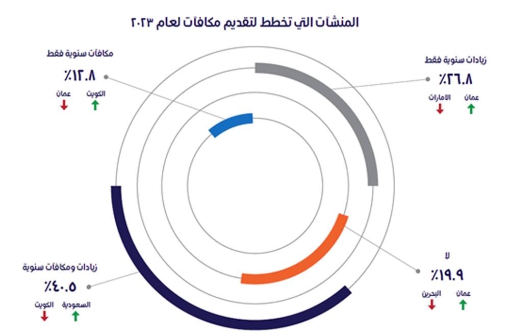 كما أقدمت 62.7 في المئة من المنشآت صرف مكافآت سنوية لموظفيها، تكريماً لمجهوداتهم في عام 2022. وكانت السعودية بنسبة 83 في المئة، وعُمان الأقل بنسبة 51 في المئة، فيما حلَّت الكويت بالمرتبة الثالثة.