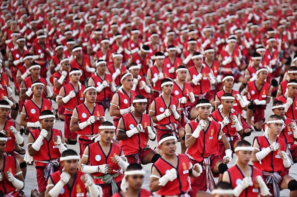 أدى الآلاف من طلاب الجيش التايلندي والجامعات وحفنة من المتطوعين عرضاً قياسياً في حفل «واي خرو» لرياضة المواي تاي (الملاكمة التايلندية) القتالية، قرب 6 تماثيل ضخمة لملوك سابقين.