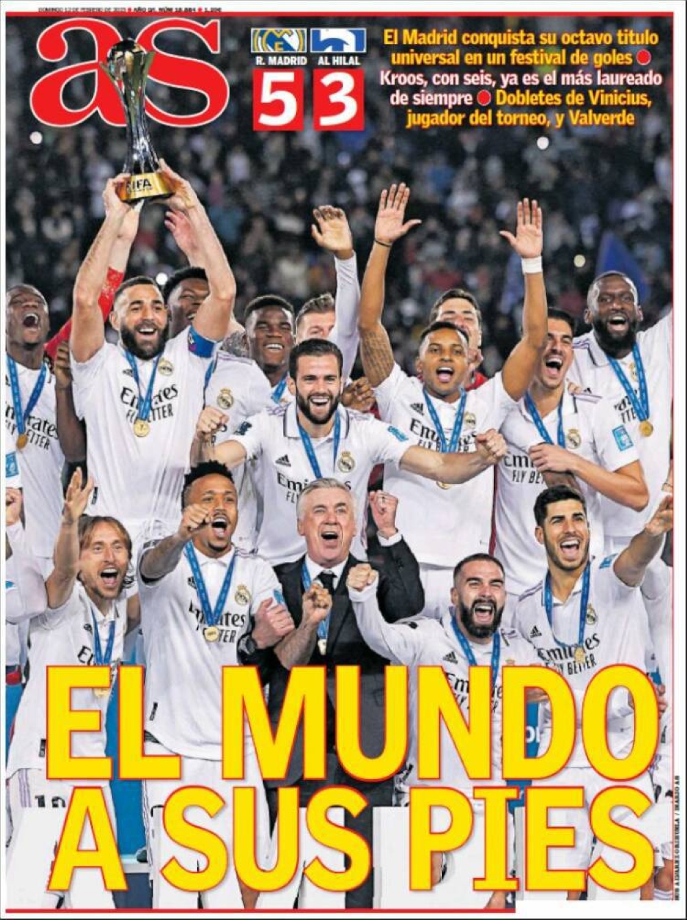 احتفت الصحافة الرياضية الإسبانية، الصادرة أمس، بتتويج ريال مدريد بمونديال الأندية، إثر تغلبه على الهلال السعودي 5-3 مساء السبت في الرباط، مسلطة الضوء على تألق اللاعب البرازيلي فينيسيوس، وسجل كل من البرازيلي فينيسيوس جونيور (13 و69) والأوروغوياني فيديريكو فالفيردي (18 و58)، وأضاف الفرنسي كريم بنزيمة العائد من إصابة (54) أهداف ريال مدريد، في حين سجل للهلال الذي كان يخوض أول نهائي له في هذه المسابقة، المالي موسى ماريغا (26)، وأضاف زميله الأرجنتيني لوسيانو فييتو هدفين (63 و79).