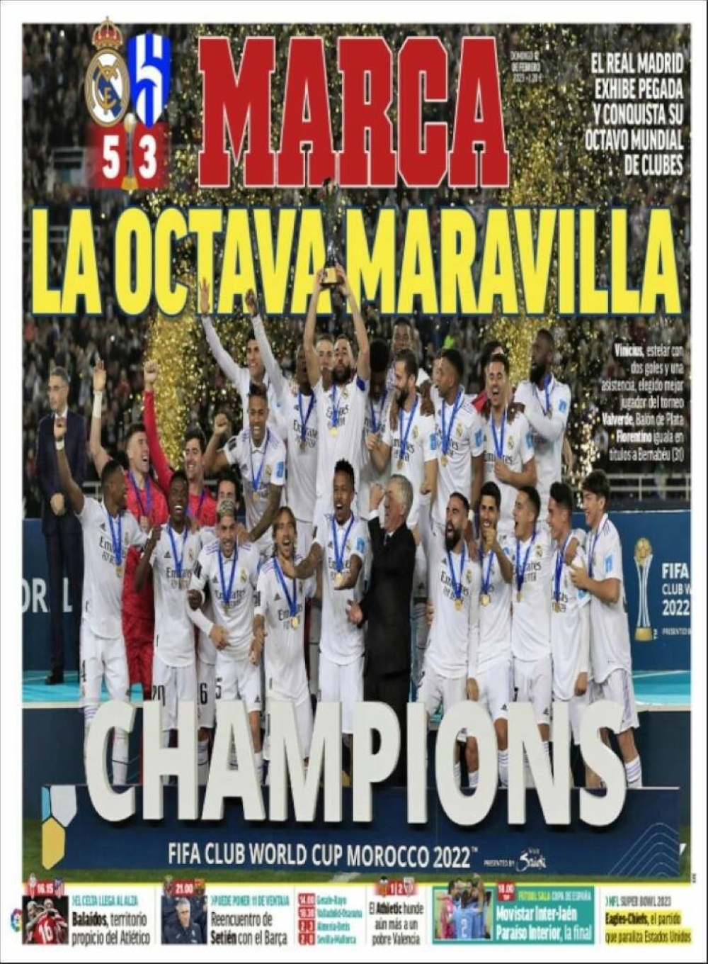 واختارت صحيفة ماركا عنواناً كتبت فيه «الأعجوبة الثامنة»، في إشارة إلى فوز الريال بمونديال الأندية بشكله الحالي 5 مرات، ترتفع إلى 8 إذا أضيفت مرات تتويجه بكأس إنتركونتيننتال، مسمى الصيغة السابقة من البطولة، وسلطت الصحيفة، في عناوين فرعية، الضوء على تألق لاعب الريال البرازيلي فينيسيوس، الذي فاز بجائزة الكرة الذهبية لأفضل لاعب في البطولة، وكذلك معادلة فلورنتينو بيريز رئيس ريال مدريد ألقاب الرئيس الأكثر تتويجاً بالبطولات في تاريخ النادي الملكي، سانتياغو برنابيو، بإجمالي 31 لقباً.
