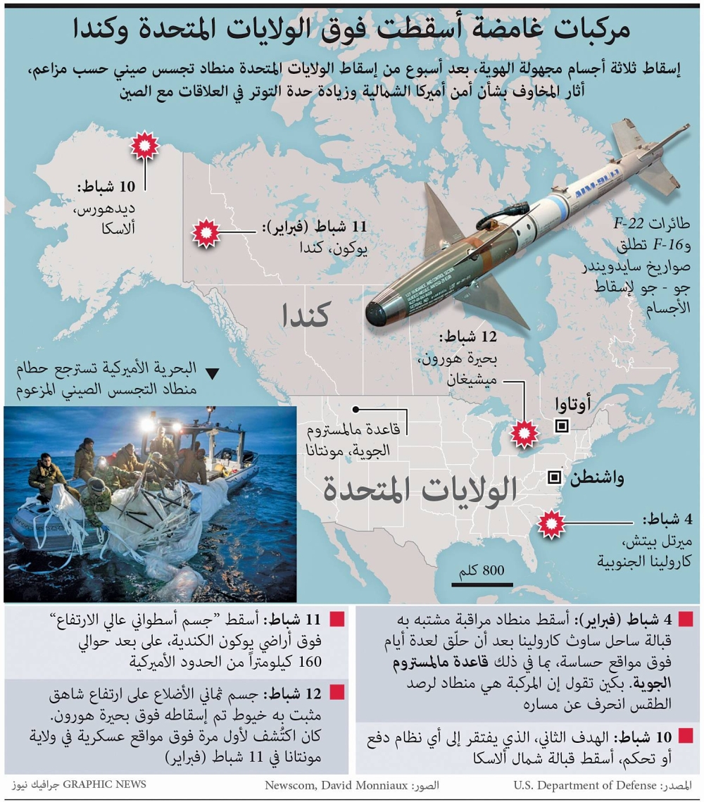 شهدت قضية مناطيد التجسس و«الأجسام الطائرة غير المحددة» (UFO) فصلاً جديداً في الساعات الماضية مع إسقاط الجيش الأميركي، للمرة الثالثة خلال أسبوع، جسماً طائراً فوق بحيرة هورون بعد إسقاطه منطاداً صينياً قالت بكين إنه مخصص لأغراض مدنية، وانحرف عن مساره، بينما تصر واشنطن على أنه تجسسي.