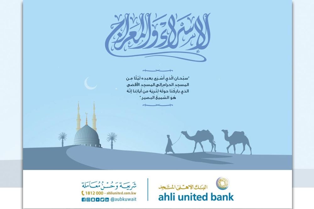 بمناسبة حلول ذكرى الإسراء والمعراج للعام الهجري 1444، يتقدم البنك الأهلي المتحد بأطيب التهاني والتبريكات إلى مقام صاحب السمو أمير البلاد الشيخ نواف الأحمد، وولي عهده الأمين سمو الشيخ مشعل الأحمد، وسمو رئيس مجلس الوزراء الشيخ أحمد نواف الأحمد، سائلين الله العلي القدير أن يحفظ الكويت وشعبها، وأن يعيد هذه المناسبات على الأمة الإسلامية والعربية بالخير واليمن والبركات.