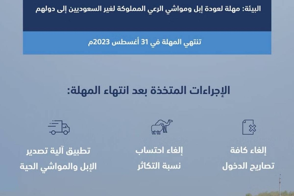 أعلنت وزارة البيئة والمياه والزراعة السعودية، عن منح مُلّاك ورعاة الإبل والمواشي المملوكة لغير السعوديين، مهلةً تصل إلى سبعة أشهر، تبدأ اليوم السبت الموافق 18 فبراير 2023م، لعودة إبلهم ومواشيهم الحية إلى دولهم.