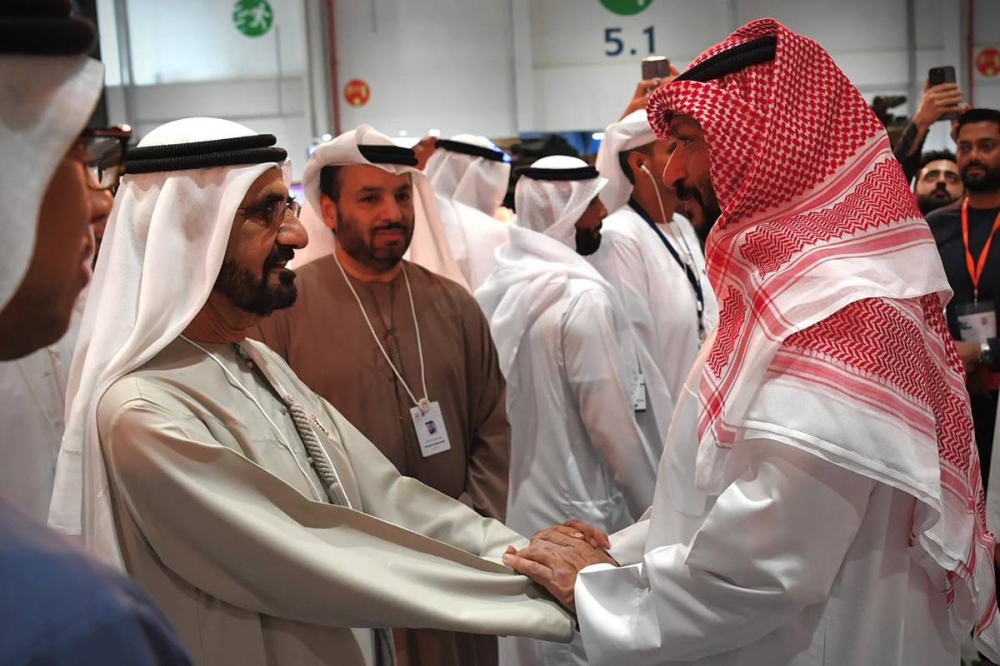 الشيخ طلال الخالد مصافحاً ولي عهد دبي رئيس المجلس التنفيذي للإمارة الشيخ حمدان بن محمد بن راشد