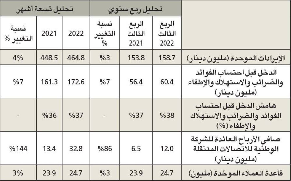• بلغ صافي الربح العائد للشركة الوطنية للاتصالات المتنقلة 32.8 مليون دينار في فترة الأشهر التسعة المنتهية في 30 سبتمبر 2022 مقارنة بـ13.4 مليونا لنفس الفترة من سنة 2021 بنمو 144%، حيث استمد دعما قويا من تحسن الإيرادات التشغيلية والمالية من Ooredoo الكويت وOoredoo تونس وOoredoo الجزائر وOoredoo فلسطين وOoredoo المالديف.