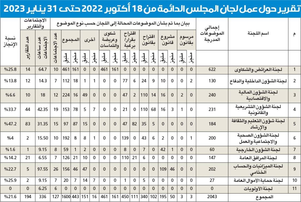 في جلسة 18 أكتوبر 2022، شكل مجلس الأمة لجانه الدائمة والمؤقتة، بكل أريحية، وحسمت أغلب مناصبها بالتزكية، بعد أن حصل معظم النواب إن لم يكن جميعهم على عضوية اللجان التي يرغبون في الانضمام إليها، وبدأت الموضوعات تتوالى إليها، سواء من النواب أو من الحكومة أو تلك التي ترد من تكليفات المجلس. وفعلياً عقدت لجان المجلس الدائمة خلال الفترة من 18 أكتوبر 2022 حتى 31 يناير الماضي 127 اجتماعاً، لم يسجل رفع اجتماع واحد لعدم اكتمال النصاب، لكن على قاعدة أن «الكرة أهداف»، فإنه بموجب الإحصائية التي أعدتها «الجريدة» خلال الفترة المشار إليها، بلغت نسبة انجاز اللجان 21.6%. وأنجزت 10 لجان دائمة 443 موضوعاً من أصل 2043، ضمنها 16 موضوعاً أنجزتها اللجنة المالية البرلمانية، والتي كانت سبباً في وصول العلاقة بين السلطتين إلى طريق مسدود، في حين سقط من جدول أعمالها برنامج عمل الحكومة باستقالتها، قبل أن تناقشه اللجنة وظل مركوناً بها.