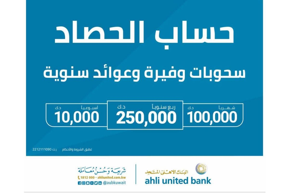 وأكدت خزعل أن البنك الأهلي المتحد حرص منذ إطلاق برنامج جوائز الحصاد الإسلامي على تقديم باقة حصرية من الجوائز بما يسهم في تحقيق تطلعات عملائه، ويعمل على تعزيز ثقافة الادخار، وشدد على التزام البنك بتوفير الحلول المصرفية الحديثة، والتي تنسجم مع متطلبات العملاء المختلفة.