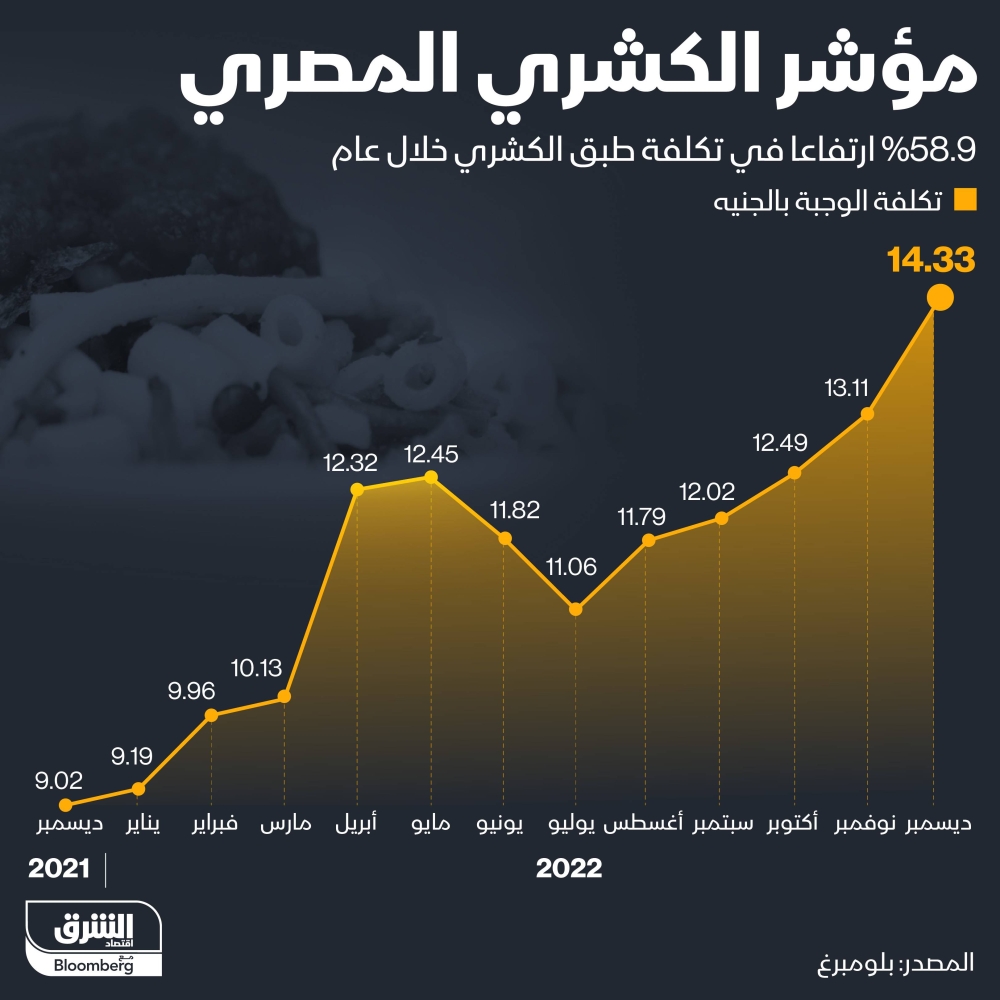 ومع تزايد هذه النوعية من المؤشرات «المطبوخة» ومحاولة قياس وتوصيف التضخم ومعدلاته، ظهر، في مصر أيضاً، «كشري إندكس»، وهو الوجبة التي تعد جزءاً أصيلاً من الثقافة الشعبية المصرية، بصرف النظر عن جدلية منشأها، وذلك بعد ما نشر موقع وكالة بلومبرغ الأميركية مؤخراً تقريراً مفصلاً يتضمن رسوماً بيانية أطلق عليها اسم «مؤشر الكشري للأسعار»، أظهر أن متوسط أسعار المكونات لطبق واحد ارتفع 58.9 في المئة على أساس سنوي في ديسمبر، أي نحو 3 أضعاف معدل التضخم في المدن المصرية البالغ 21.3 في المئة، ليتحول الطبق الشعبي من سلعة ضمن آلاف السلع التي تأثرت بالتضخم ولم تسلم من الأزمة الاقتصادية التي تمر بها البلاد، رغم رخص ثمنها، إلى مؤشر يدلل على التضخم ويقيسه لا يخلو من الطرافة وخفة الظل.