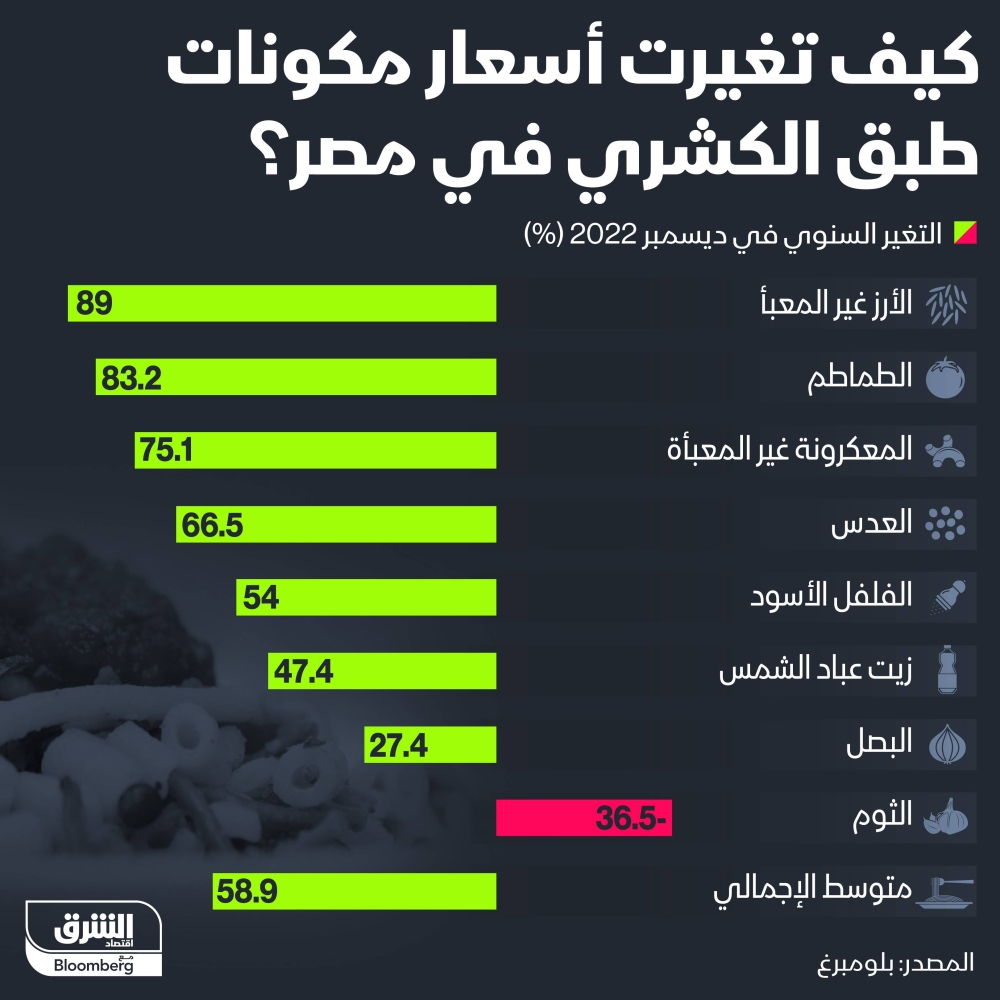 وفي التفاصيل التي ذكرها تقرير «بلومبرغ»، يجسد ارتفاع تكلفة الطبق الشهير أكبر التداعيات السلبية غير المباشرة للغزو الروسي لأوكرانيا. فقد تأثر اقتصاد مصر، وهي مستورد رئيسي للقمح وسلع أساسية أخرى، بشكل كبير بسبب ارتفاع تكلفة الاستيراد خلال العام الماضي، وساعدت سلسلة من التخفيضات في قيمة العملة في التعامل مع أزمة النقد الأجنبي، لكنها ساهمت في رفع أسعار العديد من المنتجات الغذائية أكثر من أي وقت مضى.