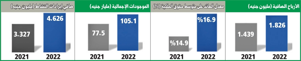 ونما إجمالي أصول البنك إلى 105.14 مليارات جنيه حتى نهاية عام 2022، مقابل 77.49 ملياراً في نهاية عام 2021، بنسبة نمو بلغت 36%، بينما بلغ صافي رصيد القروض والتسهيلات الائتمانية 54.31 ملياراً حتى نهاية ديسمبر 2022، مقابل 40.72 ملياراً في نهاية عام 2021 بنسبة نمو 33%، وزادت ودائع العملاء لتصل إلى 84.46 ملياراً في 31 ديسمبر 2022، مقابل 62.02 ملياراً بنهاية عام 2021 بنسبة نمو بلغت 36%، ونمت حقوق الملكية في نهاية عام 2022 بنسبة 9%، لتصل إلى 11.270 مليار جنيه، مقابل 10.298 مليارات بنهاية عام 2021.
