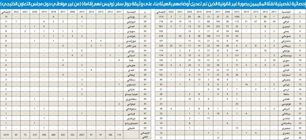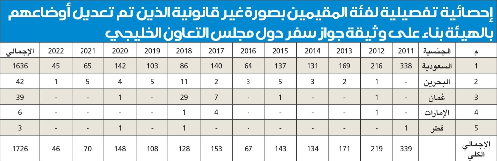 وكشفت ان المقيمين بصورة غير قانونية الذين تم تعديل أوضاعهم للهيئة بناء على وثيقة جواز سفر ولهم إقامة صالحة من غير مواطني دول مجلس التعاون الخليجي بلغوا 471 شخصا، اما المقيمون بصورة غير قانونية الذين تم تعديل أوضاعم بالهيئة بناء على وثيقة جواز سفر ولهم إقامة منتهية من غير مواطني دول مجلس التعاون الخليجي فبلغوا 86 شخصا، في حين بلغ المقيمون بصورة غير قانونية الذين تم تعديل أوضاعهم بالهيئة بناء على وثيقة جواز سفر وليس لهم اقامة من غير مواطني دول مجلس التعاون الخليجي 5219.