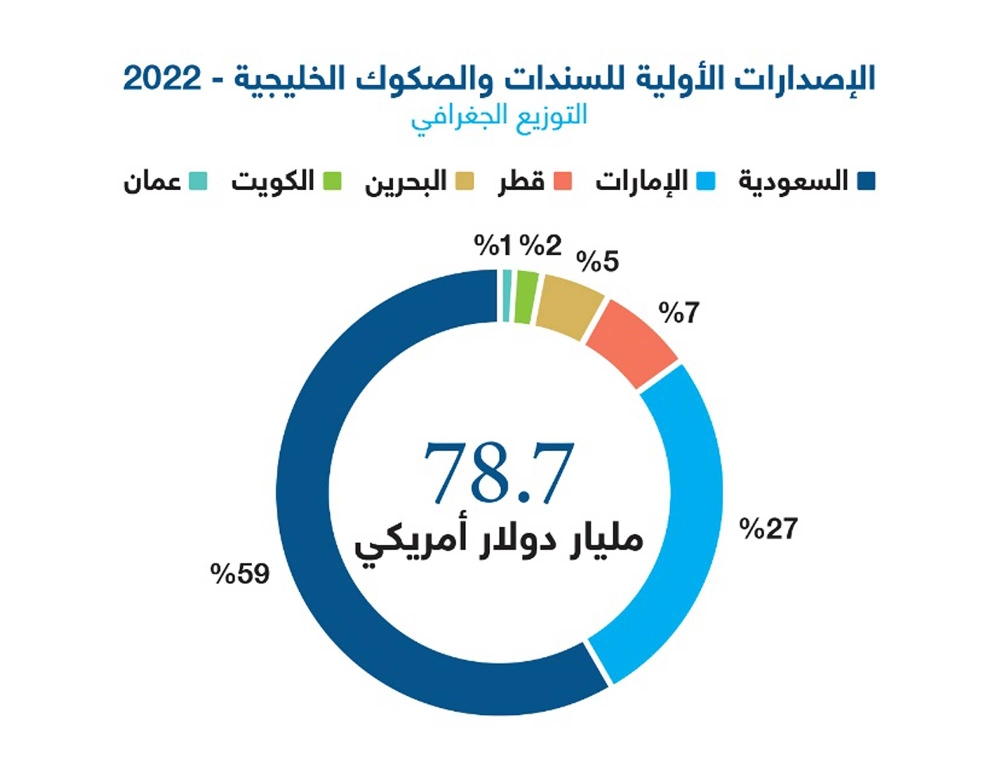 تصدّرت المملكة العربية السعودية إجمالي الإصدارات الأولية للسندات والصكوك الخليجية خلال عام 2022 بقيمةٍ إجماليةٍ بلغت 46.4 مليار دولار عبر 41 إصدار، ما يمثل 59% من الإجمالي، تليها الإمارات العربية المتحدة بنسبة 27%، وقطر في المركز الثالث بنسبة 7%، في حين بلغت حصة الإصدارات الكويتية 1.3 مليار دولار ما يمثل 2% من إجمالي قيمة الإصدارات الخليجية الأولية خلال عام 2022.