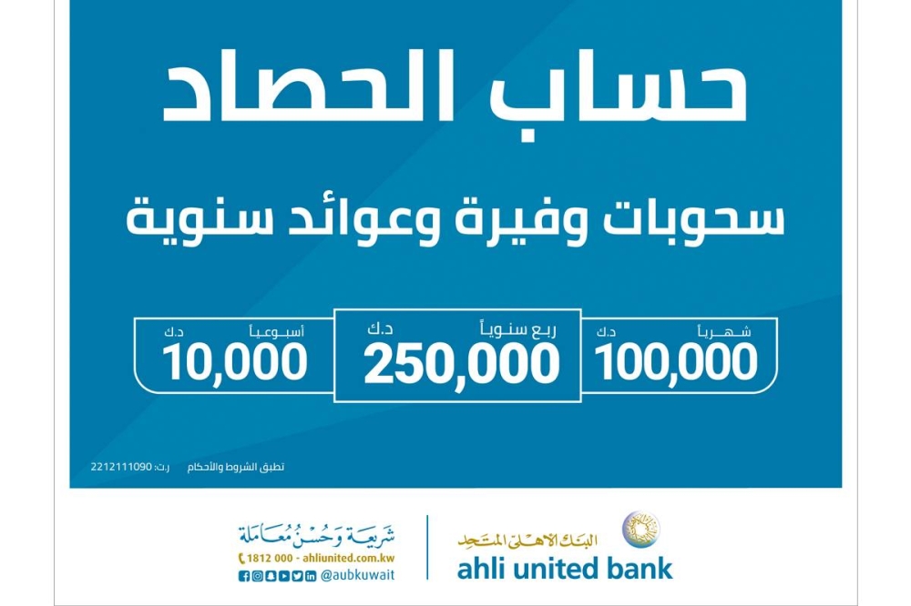 علما أن الحد الأدنى للمشاركة والاستفادة من السحوبات كافة هي 100 د.ك، تؤهل العميل للحصول على فرصتين لدخول السحب، والتي تزيد حتى 30000 فرصة في السحب، إضافة إلى الحصول على أرباح سنوية مثمرة، وتتيح كل 50 دينارا في حساب العميل فرصة واحدة للمشاركة في السحب، بشرط أن يحافظ على رصيده لمدة 15 يوما على الأقل قبل تاريخ السحب، وكلما زادت مدة الاحتفاظ زادت فرص دخول السحب لكل 50 دينارا، ويتم إجراء السحوبات كل أربعاء بناء على خطة السحب.
