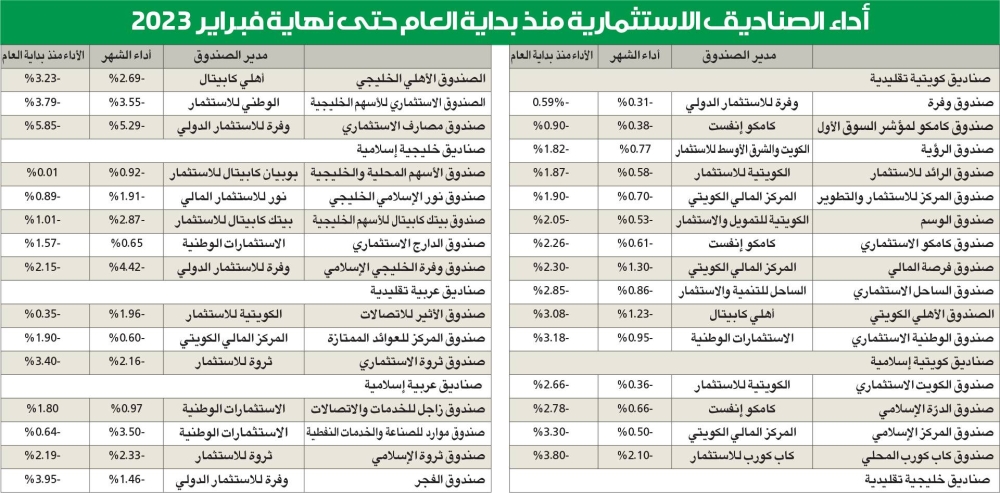 وحقق صندوق خدمات واحد أرباحاً جيدة قياساً إلى الخسائر لنحو 28 صندوقاً، إذ كسب صندوق زاجل 1.28 بالمئة عائداً منذ بداية العام حتى نهاية فبراير.