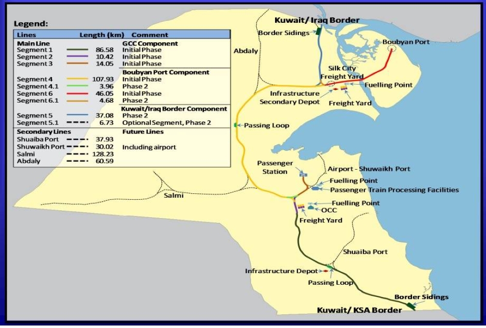 أبوظبي والعين، ومن ثم إلى مسقط عبر صحار.ويقدر الطول الإجمالي للمسار بـ 2117 كم، وتكون سرعة قطارات نقل الركاب نحو 220 كم/ ساعة، وقطارات نقل البضائع ما بين 80 و120 كم/ ساعة، ويتم استخدام أفضل المواصفات والمعايير المتوفرة إقليميا وعالميا في قطاع السكك الحديدية للمشروع مثل الأحمال المحورية، والإشارات وأنظمة الاتصالات، وأنظمة التشغيل والصيانة.
