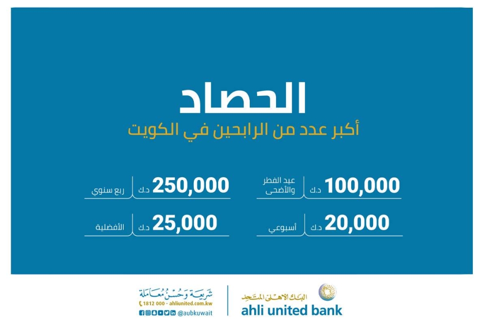 أجرى البنك الأهلي المتحد، اليوم، السحب الأسبوعي على جوائز الحصاد الإسلامي، حساب السحب على الجوائز الإسلامي الأول في الكويت، والذي ينفرد بالعديد من المميزات، منها أنه أبسط وأسهل برنامج ادخار، فضلاً عن ميزة فتح الحساب عبر الإنترنت بكل سهولة ويُسر مع ميزة الإيداع الفوري في الحساب.