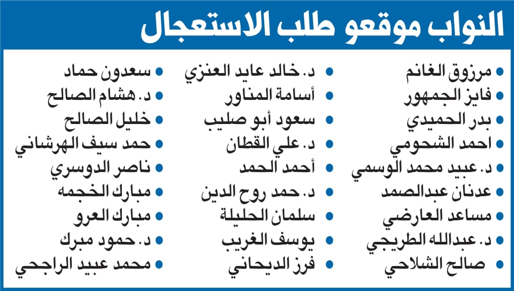 وذكرت المصادر أن 18 نائباً اجتمعوا في ديوان النائب خالد المونس صباح أمس، واتفقوا على تأجيل بيانهم الذي كان مقررا إصداره إلى اجتماع يعقد لاحقاً في وقت متأخر من مساء امس بديوان النائب شعيب المويزري، والذي لم يصدر حتى طباعة «الجريدة».