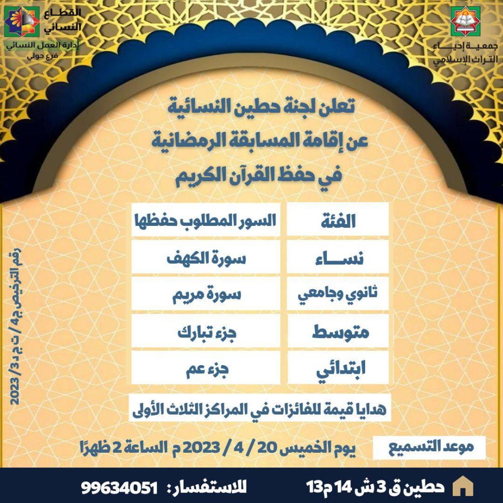 في هذا السياق تنظم لجنة حطين النسائية مسابقة في حفظ القرآن الكريم، والتي تم تقسيمها الى 4 فئات: النساء في حفظ سورة (الكهف)، و«الثانوية» و«الجامعية» في سورة (مريم)، أما فئة «المتوسطة» فسيكون الحفظ فيها لجزء (تبارك)، و«الابتدائية» في جزء (عم)، وسيكون التسميع لها يوم الخميس المقبل الساعة 2 ظهراً، كما تنظم لجنة حطين محاضرة بعنوان: «رمضان شهر الدعاء» للشيخ أحمد الرمح باللغة الإنكليزية عبر البث المباشر (الزوم).