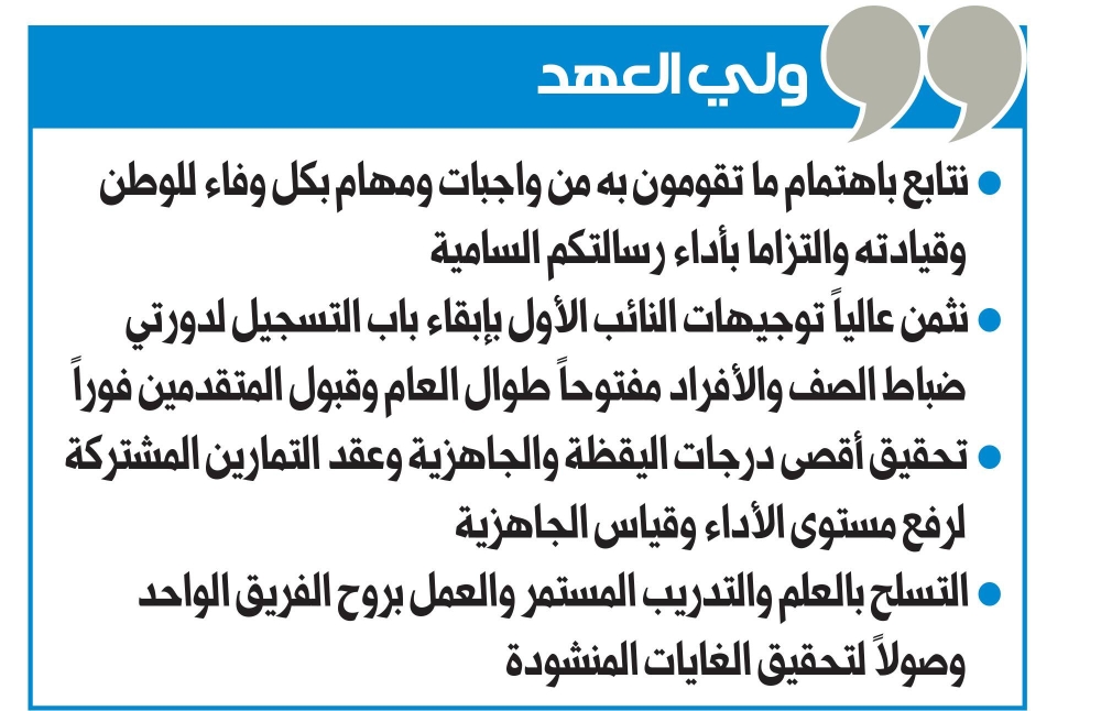 وثمن سموه عالياً توجيهات النائب الأول بإبقاء باب التسجيل لدورتي ضباط الصف والأفراد مفتوحاً طوال العام وقبول المتقدمين بشكل فوري بعد التأكد من استيفائهم لشروط القبول واجتيازهم للاختبارات والفحوصات الطبية ومشاركة وزارة الدفاع كذلك في معرض الفرص الوظيفية لاستقطاب الشباب الراغبين في نيل شرف الانخراط في العمل العسكري وخدمة وطننا العزيز.