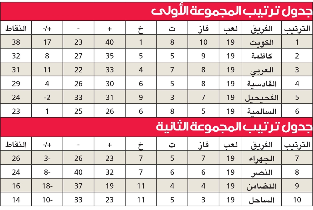 في المقابل، فإن المجموعة الثانية «الهبوط»، فقد فرضت الحسابات نفسها بقوة بعد فوز الجهراء السابع وله 26 نقطة على الساحل الأخير وله 14 بهدفين لهدف، والنصر الثامن وله 24 نقطة على التضامن التاسع برصيد 16 مقطة بهدفين نظيفين.